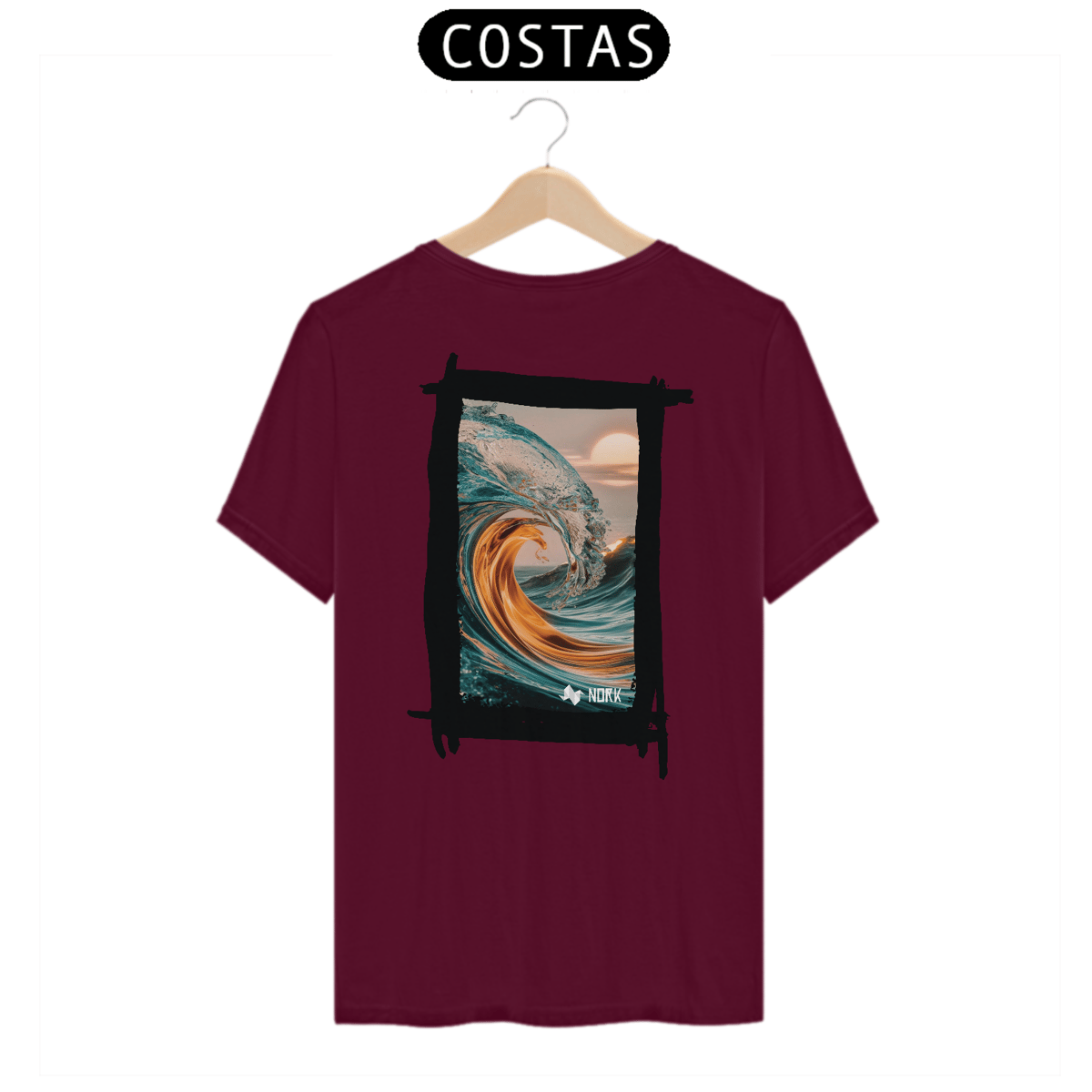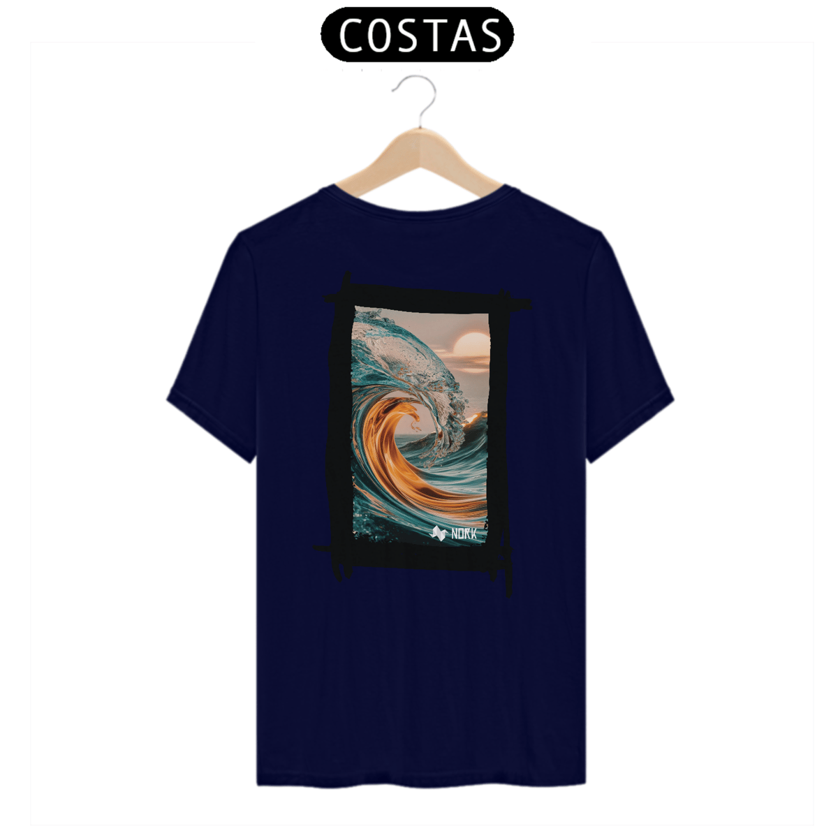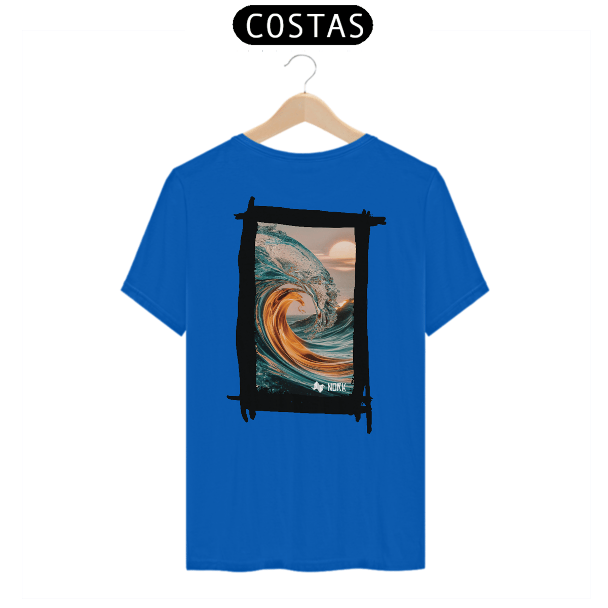 A camisa exibe uma arte impressionante que une a força do oceano com uma estética etérea. A composição apresenta uma onda em tons de azul cristalino misturada a nuances douradas que evocam a luz do sol, criando uma sensação de energia e calor. A curva perfeita da onda, capturada com detalhes precisos, transmite a grandiosidade e a beleza dinâmica do mar, enquanto o fundo com um céu suave e um sol nascente ou poente adiciona serenidade e harmonia ao visual. O jogo de cores e texturas cria uma peça que simboliza tanto a força quanto a tranquilidade do oceano, ideal para quem busca um estilo que equilibre intensidade e leveza. O logo da Nork está posicionado discretamente na parte inferior, reforçando a exclusividade da peça.