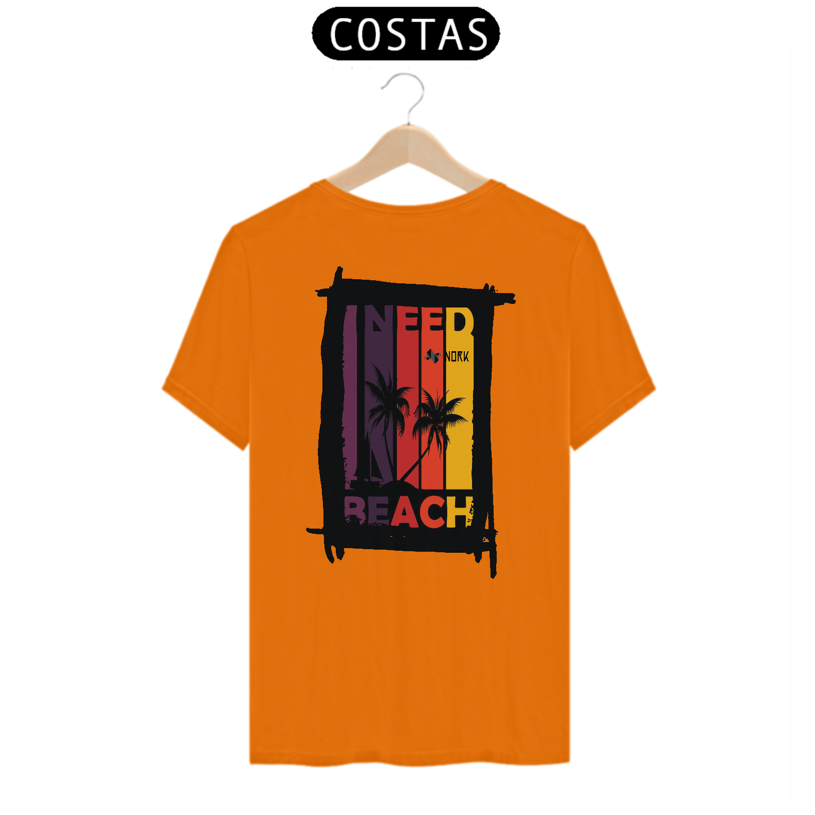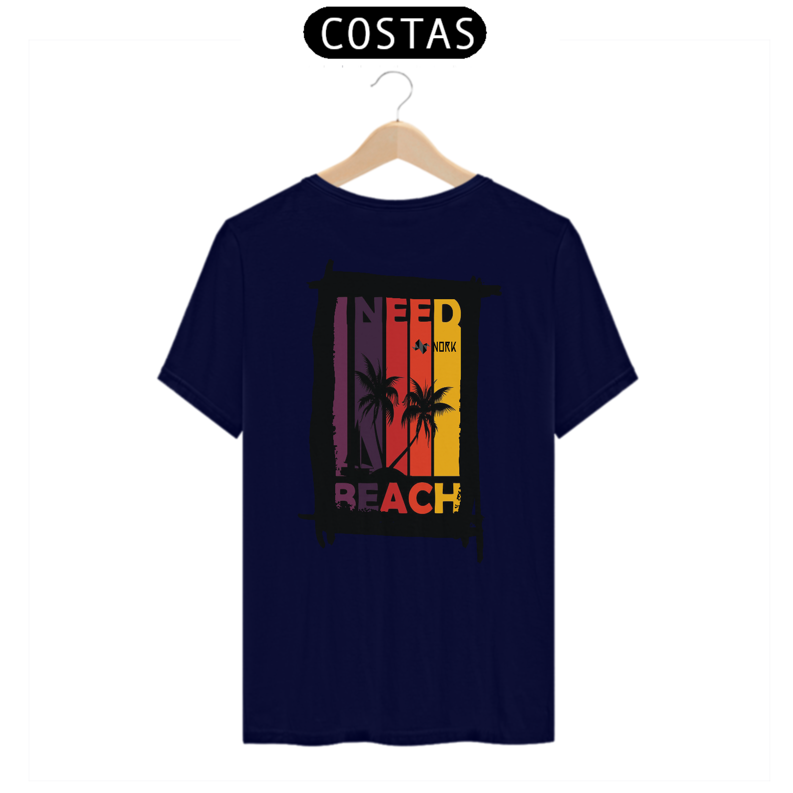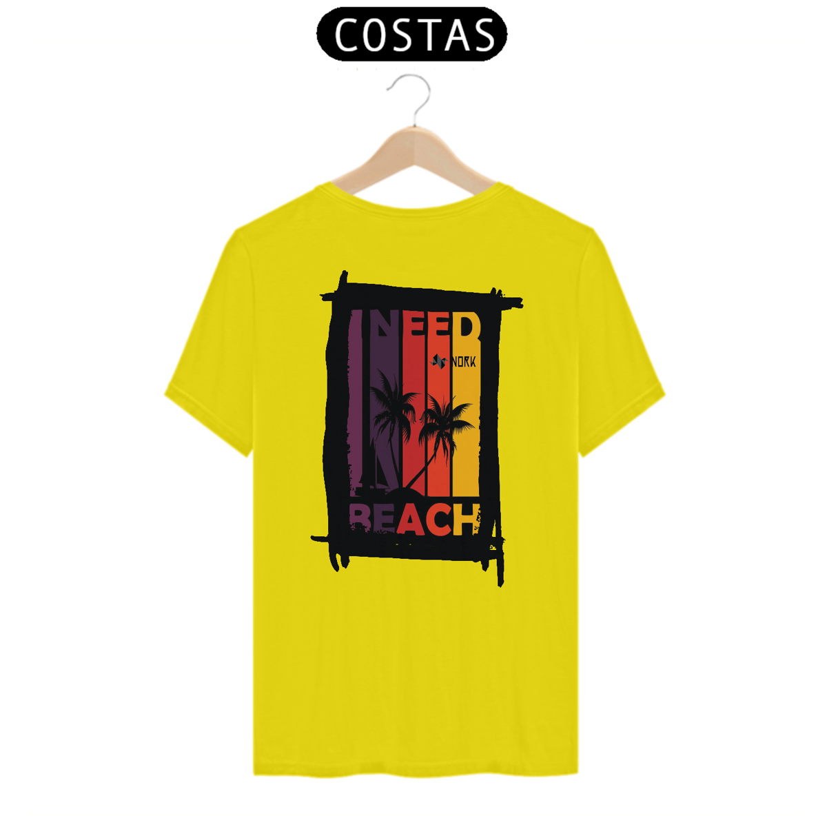 A camisa traz uma arte com um apelo tropical e vibrante, perfeita para amantes da praia e da vibe descontraída do verão. A composição é dividida em faixas verticais em degradê de tons quentes, que vão do roxo profundo ao amarelo intenso, criando um efeito de pôr do sol estilizado. No centro da arte, a silhueta de coqueiros e um veleiro preto contrastam de maneira marcante com o fundo colorido, remetendo à tranquilidade e beleza de uma tarde à beira-mar. A frase “I NEED BEACH” complementa o design de forma moderna e expressiva, reforçando a temática tropical e o desejo por momentos de descontração. O logo da Nork está integrado de forma sutil, mas elegante, no topo da composição.