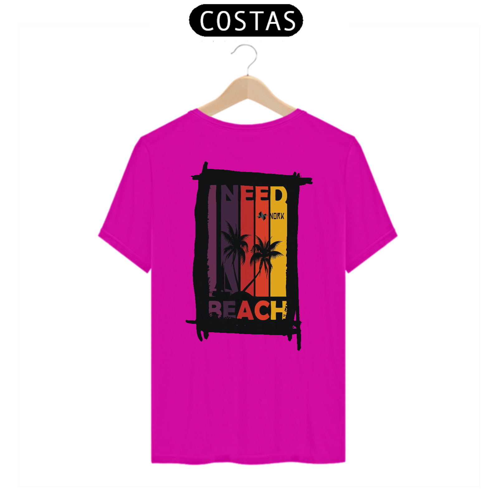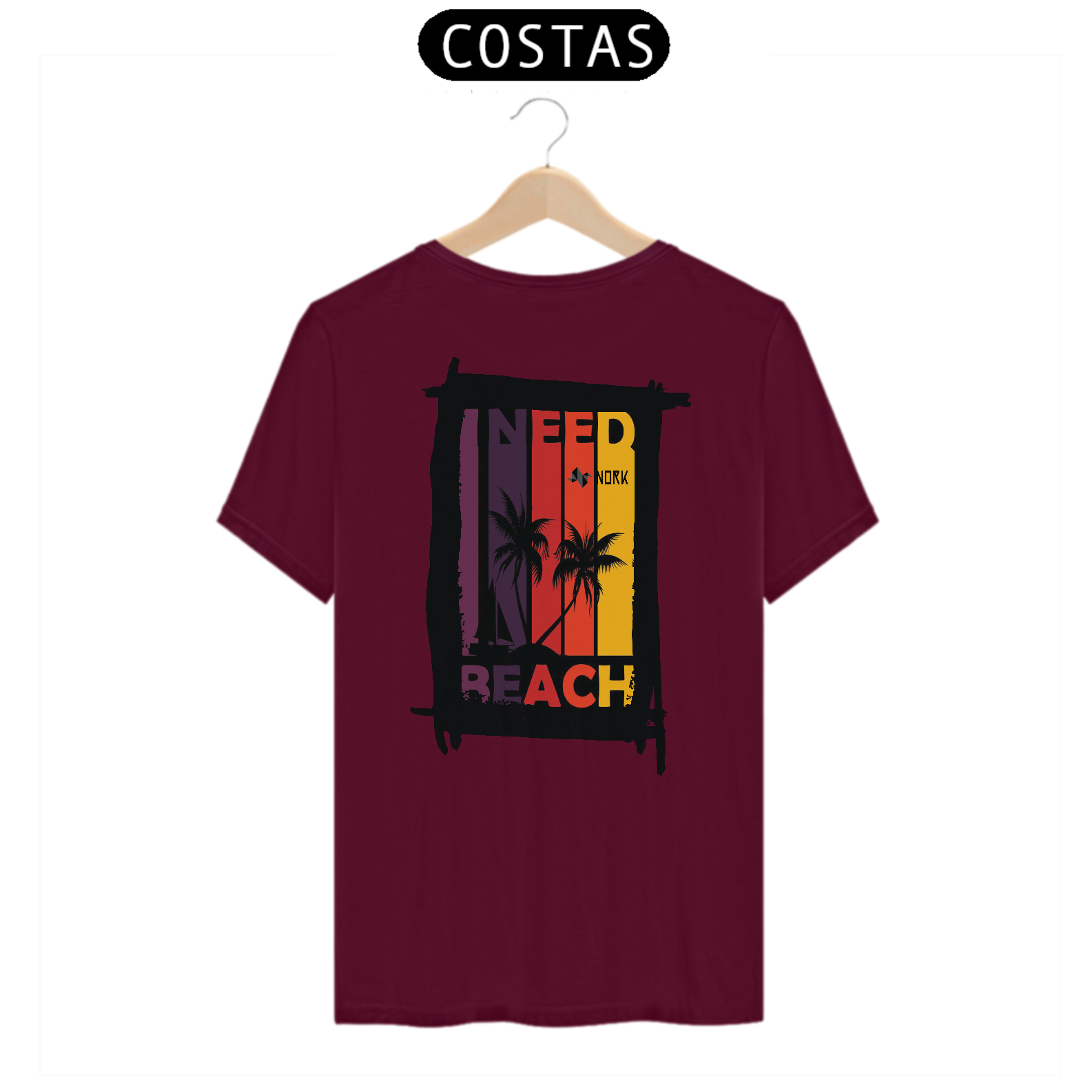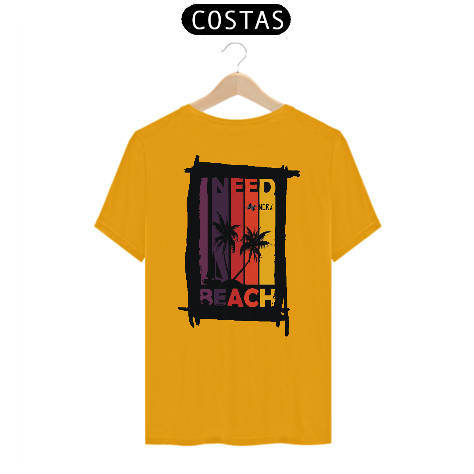A camisa traz uma arte com um apelo tropical e vibrante, perfeita para amantes da praia e da vibe descontraída do verão. A composição é dividida em faixas verticais em degradê de tons quentes, que vão do roxo profundo ao amarelo intenso, criando um efeito de pôr do sol estilizado. No centro da arte, a silhueta de coqueiros e um veleiro preto contrastam de maneira marcante com o fundo colorido, remetendo à tranquilidade e beleza de uma tarde à beira-mar. A frase “I NEED BEACH” complementa o design de forma moderna e expressiva, reforçando a temática tropical e o desejo por momentos de descontração. O logo da Nork está integrado de forma sutil, mas elegante, no topo da composição.