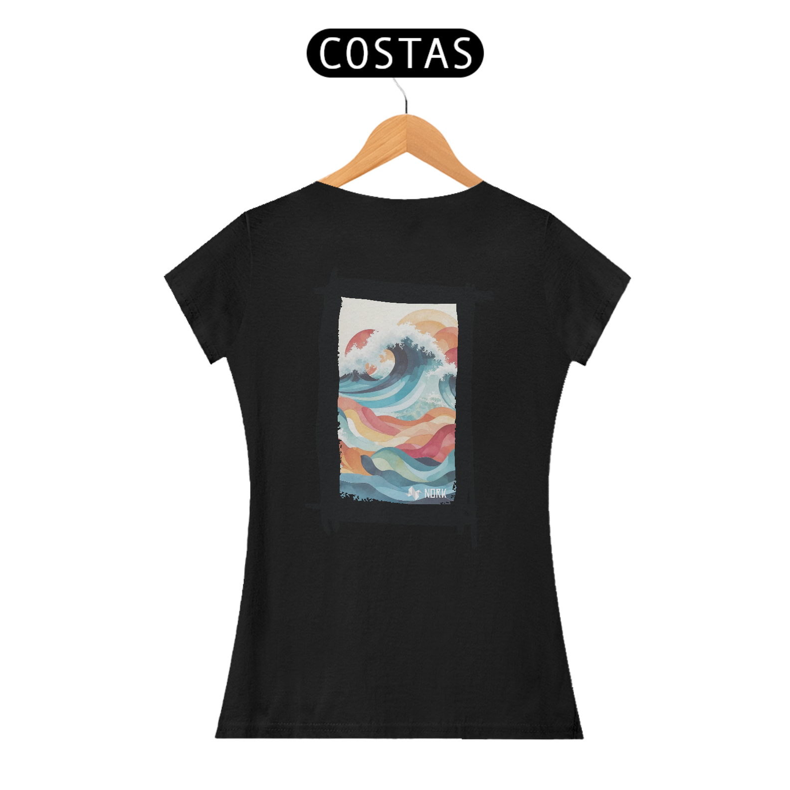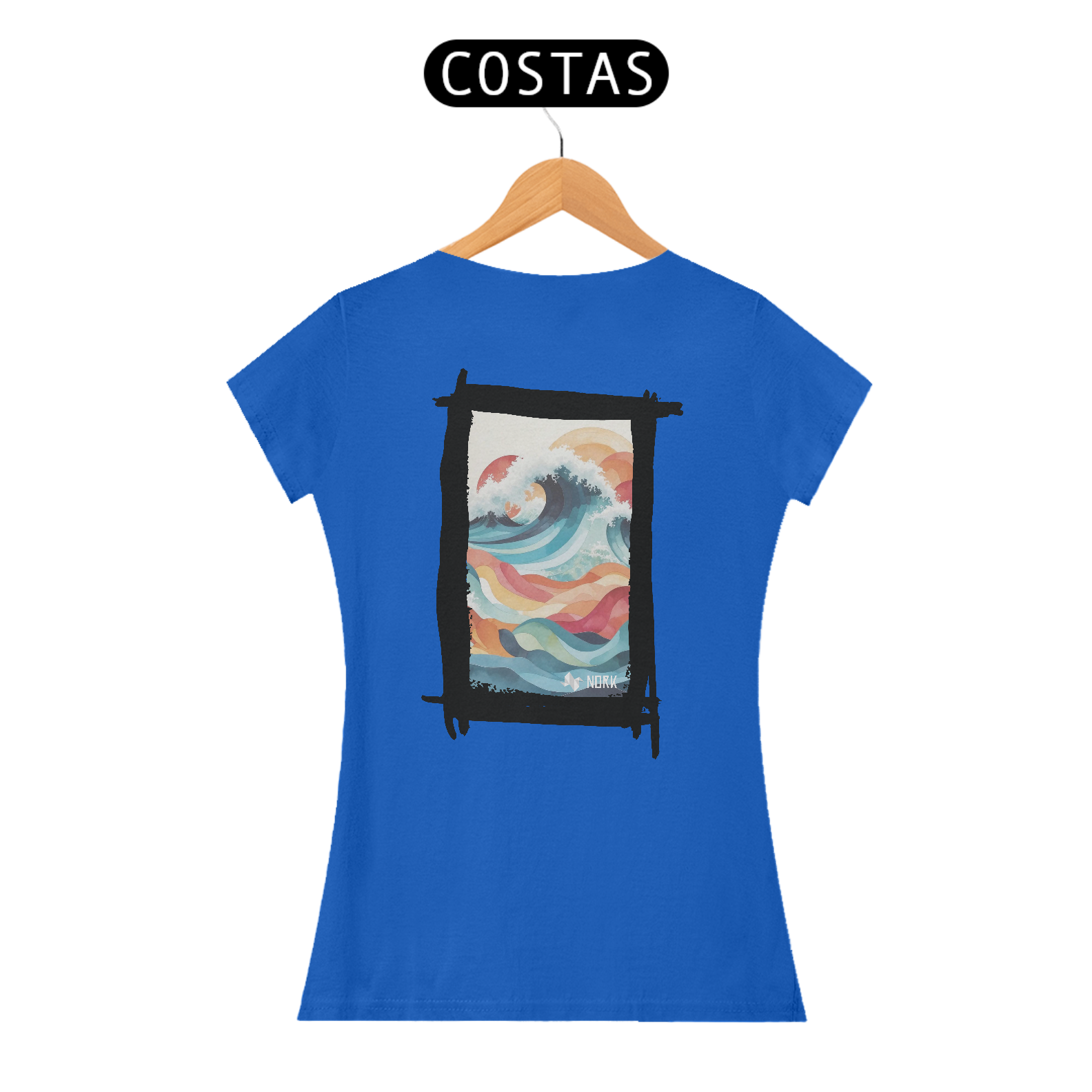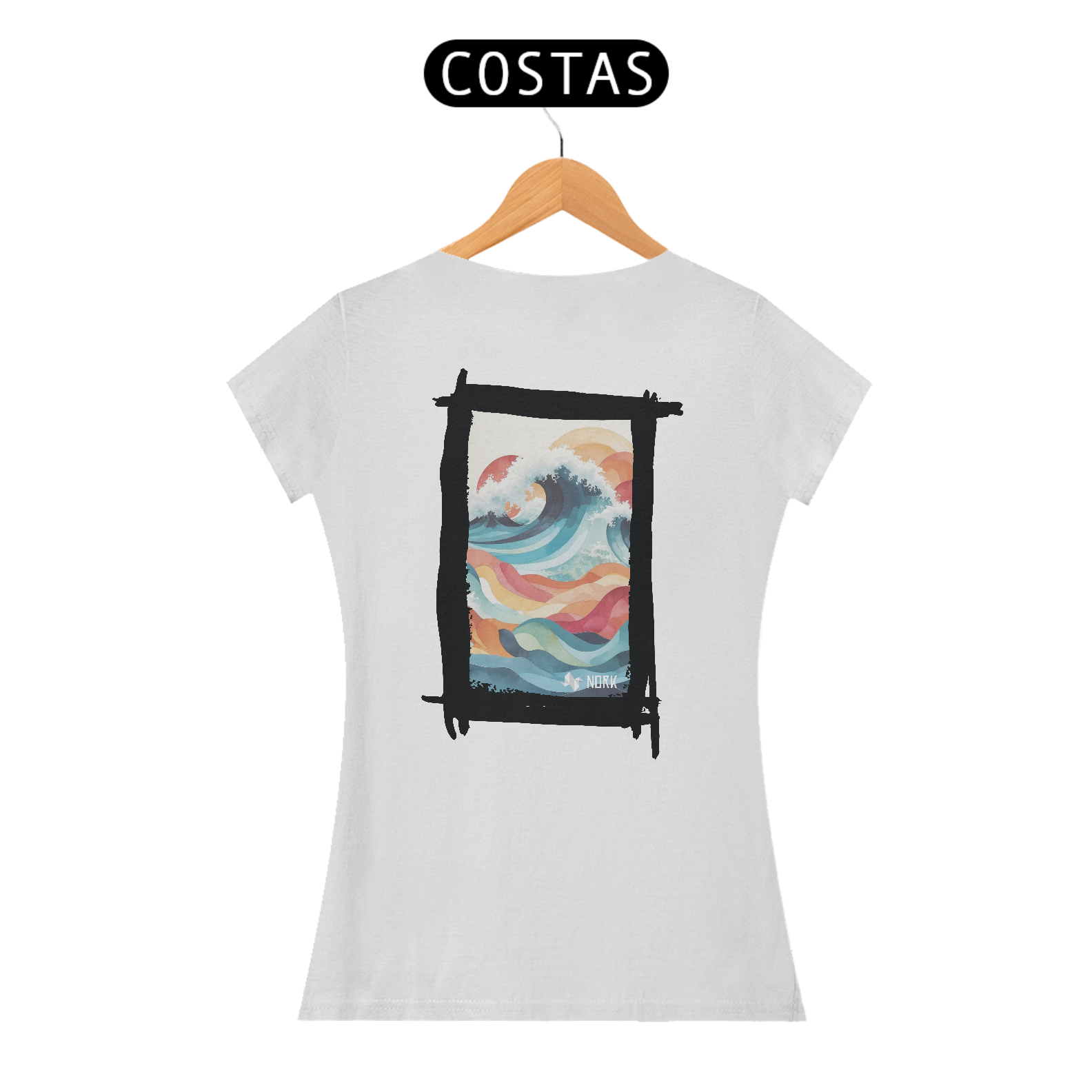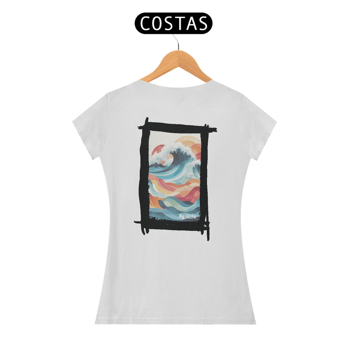 A camisa apresenta uma arte fluida e encantadora que combina formas geométricas onduladas e uma paleta de cores suaves e vibrantes, criando uma sensação de movimento e harmonia. O design destaca uma onda estilizada em tons de azul profundo, azul claro e branco, representando a espuma do mar em contraste com ondas menores abaixo, em cores quentes como laranja, vermelho e amarelo. A composição remete à união do mar e do céu, com um fundo claro que enfatiza os detalhes coloridos. A estética artística e moderna dessa peça a torna ideal para quem aprecia um estilo leve e expressivo. O logo da Nork aparece discretamente na parte inferior, reforçando a sofisticação e exclusividade do design.