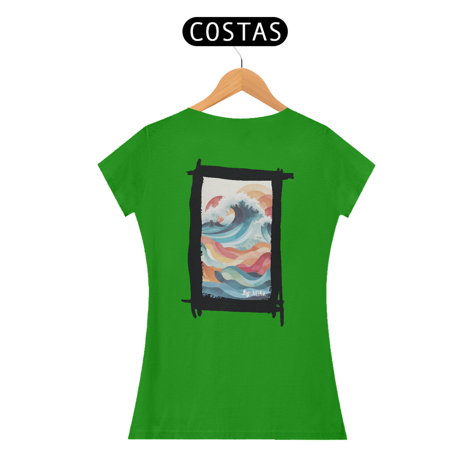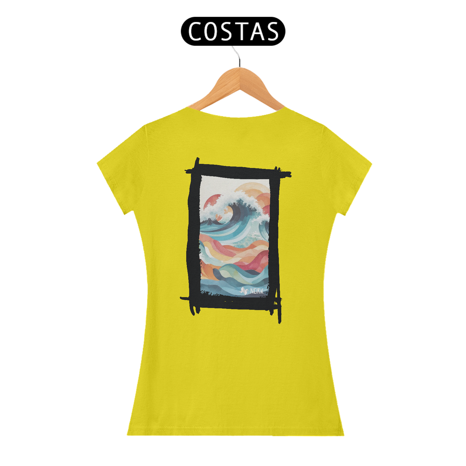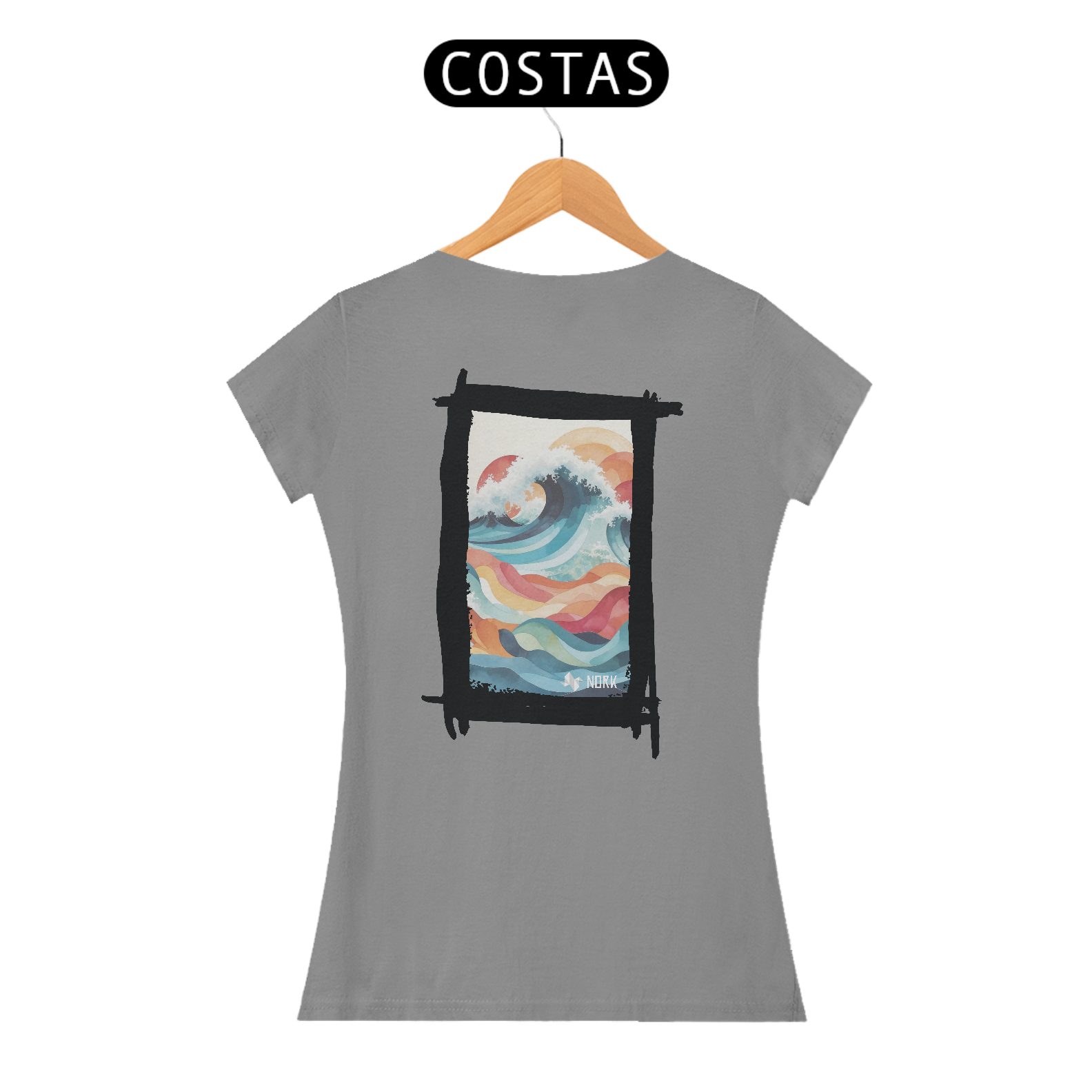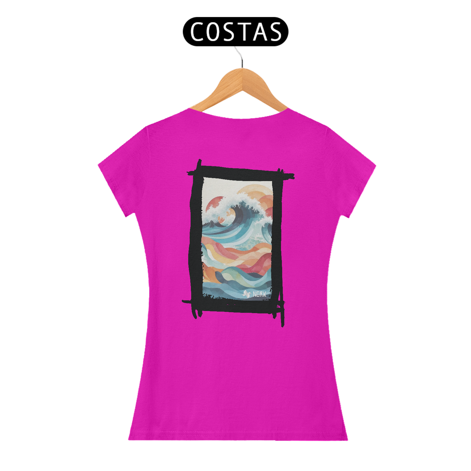 A camisa apresenta uma arte fluida e encantadora que combina formas geométricas onduladas e uma paleta de cores suaves e vibrantes, criando uma sensação de movimento e harmonia. O design destaca uma onda estilizada em tons de azul profundo, azul claro e branco, representando a espuma do mar em contraste com ondas menores abaixo, em cores quentes como laranja, vermelho e amarelo. A composição remete à união do mar e do céu, com um fundo claro que enfatiza os detalhes coloridos. A estética artística e moderna dessa peça a torna ideal para quem aprecia um estilo leve e expressivo. O logo da Nork aparece discretamente na parte inferior, reforçando a sofisticação e exclusividade do design.