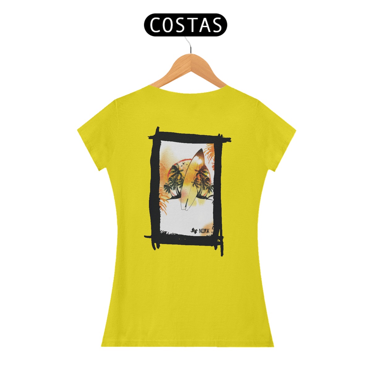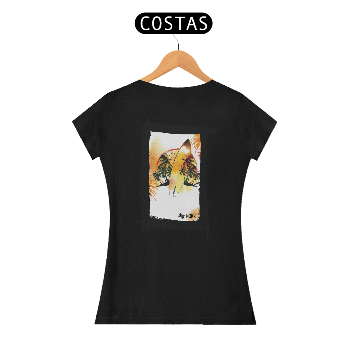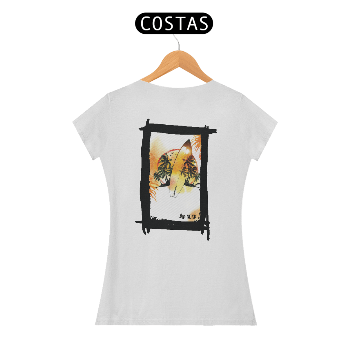 A camisa apresenta uma arte tropical e descontraída, perfeita para os amantes do surfe e do estilo de vida praiano. No centro, uma prancha de surfe em destaque reflete as cores quentes do pôr do sol, em tons de amarelo, laranja e vermelho, criando uma fusão harmônica com o cenário ao fundo. Palmeiras exuberantes, sombras de pássaros em voo e um horizonte vibrante complementam a composição, transmitindo uma sensação de liberdade e conexão com a natureza. A textura sutil de linhas diagonais no fundo adiciona um toque moderno e dinâmico ao design. O logo da Nork está inserido de forma discreta na parte inferior, reforçando a identidade premium da peça.
