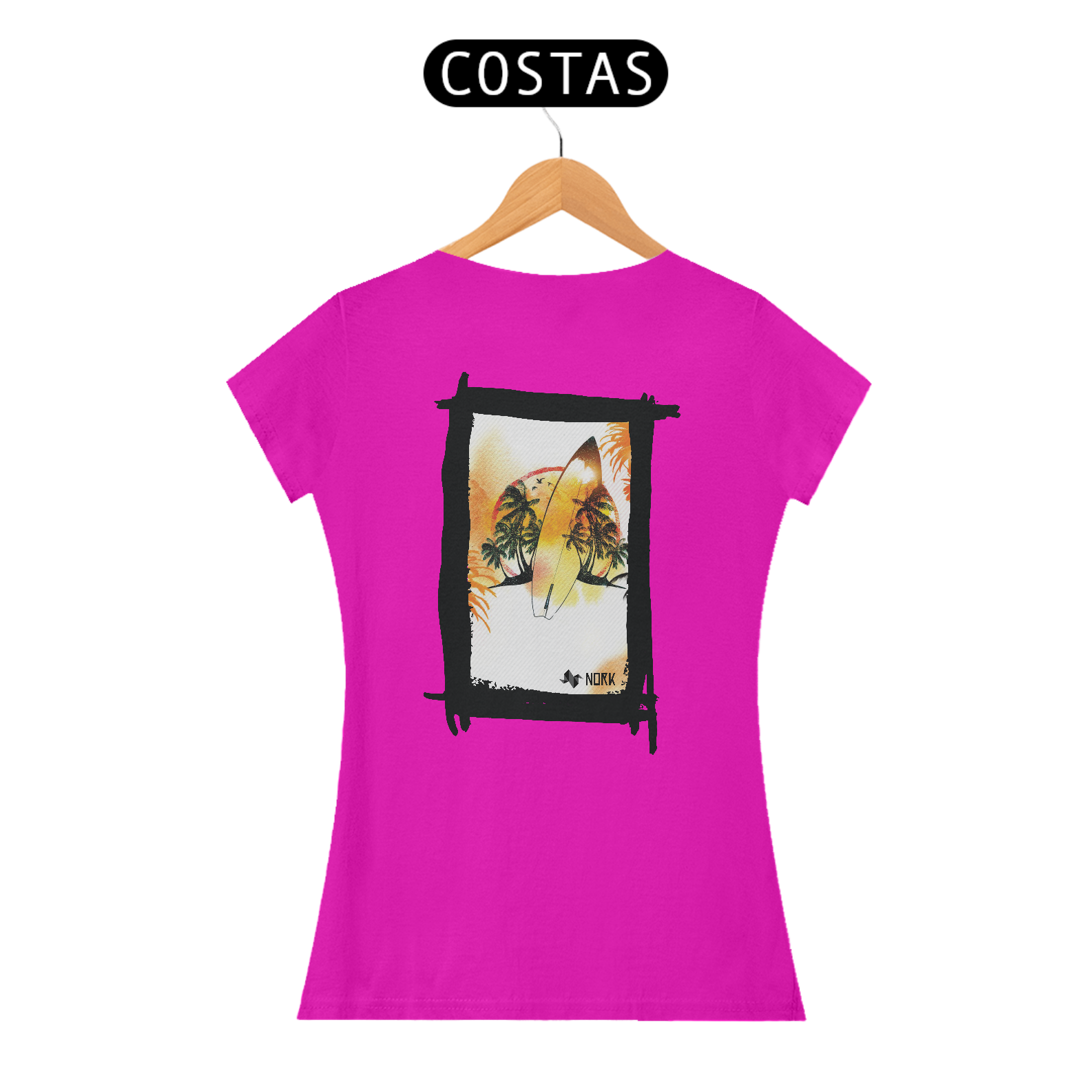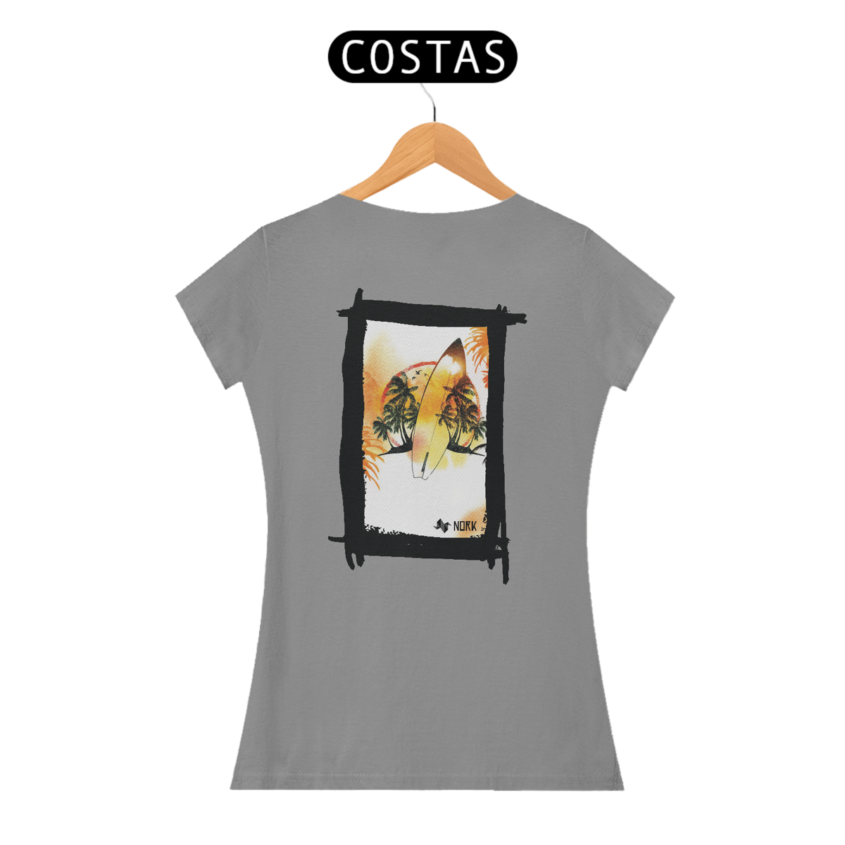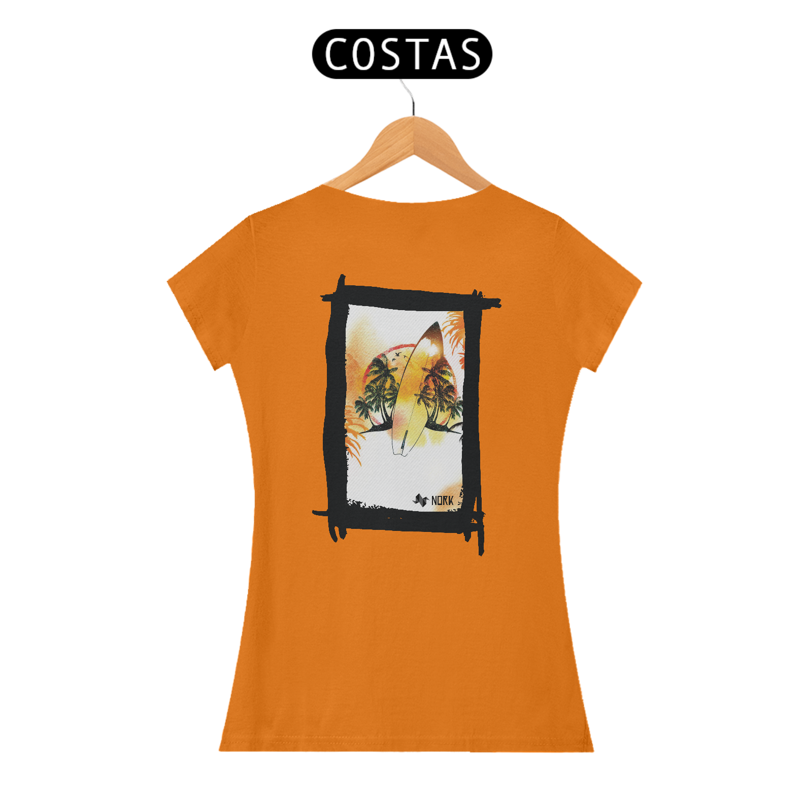 A camisa apresenta uma arte tropical e descontraída, perfeita para os amantes do surfe e do estilo de vida praiano. No centro, uma prancha de surfe em destaque reflete as cores quentes do pôr do sol, em tons de amarelo, laranja e vermelho, criando uma fusão harmônica com o cenário ao fundo. Palmeiras exuberantes, sombras de pássaros em voo e um horizonte vibrante complementam a composição, transmitindo uma sensação de liberdade e conexão com a natureza. A textura sutil de linhas diagonais no fundo adiciona um toque moderno e dinâmico ao design. O logo da Nork está inserido de forma discreta na parte inferior, reforçando a identidade premium da peça.