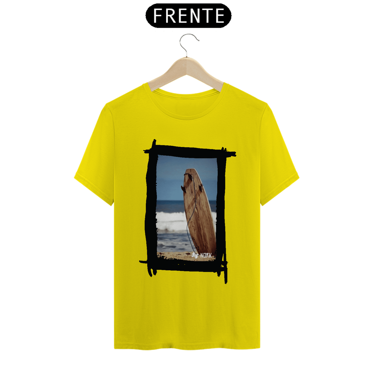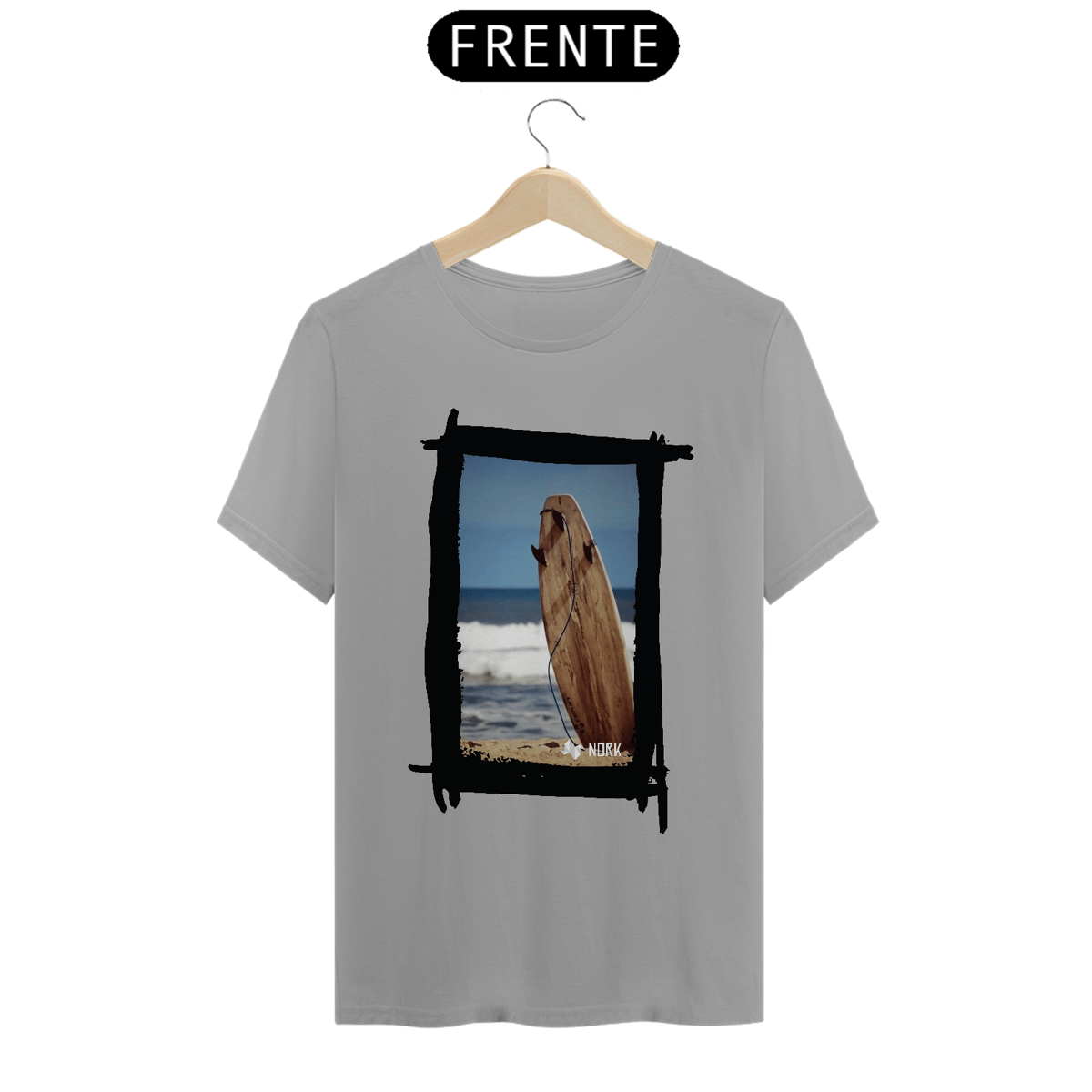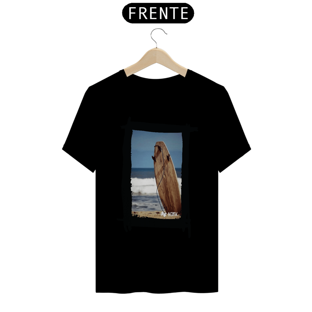 A camisa apresenta uma arte minimalista e natural que evoca a essência pura do surfe. A composição destaca uma prancha de surfe de madeira fincada na areia, com o mar calmo ao fundo e um céu azul que transmite serenidade. O visual da prancha em tons terrosos, combinados com a textura rústica, reforça a conexão com a natureza e o estilo de vida simples e despojado dos surfistas. A presença do leash conectado à prancha é um detalhe sutil que adiciona autenticidade à imagem, criando uma peça ideal para quem valoriza a simplicidade e o espírito livre. O logo da Nork aparece discretamente na parte inferior, mantendo a identidade da marca.