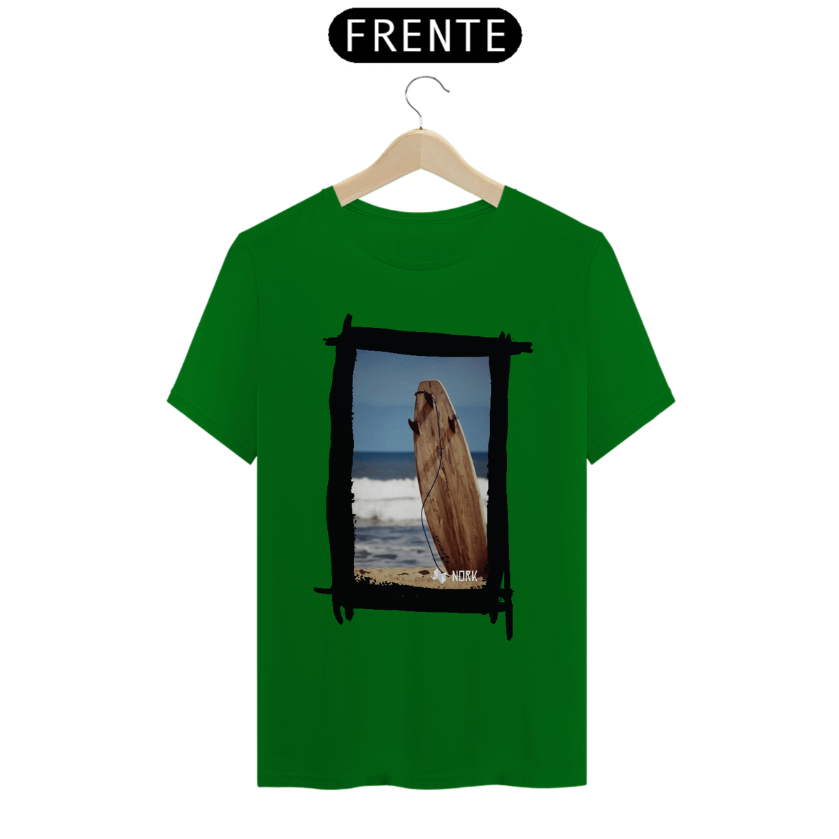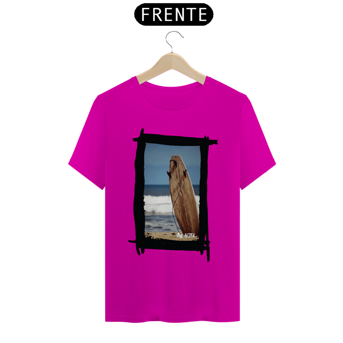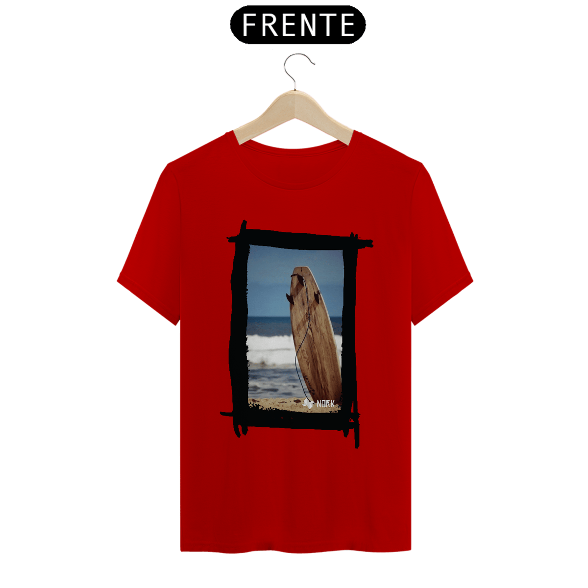 A camisa apresenta uma arte minimalista e natural que evoca a essência pura do surfe. A composição destaca uma prancha de surfe de madeira fincada na areia, com o mar calmo ao fundo e um céu azul que transmite serenidade. O visual da prancha em tons terrosos, combinados com a textura rústica, reforça a conexão com a natureza e o estilo de vida simples e despojado dos surfistas. A presença do leash conectado à prancha é um detalhe sutil que adiciona autenticidade à imagem, criando uma peça ideal para quem valoriza a simplicidade e o espírito livre. O logo da Nork aparece discretamente na parte inferior, mantendo a identidade da marca.