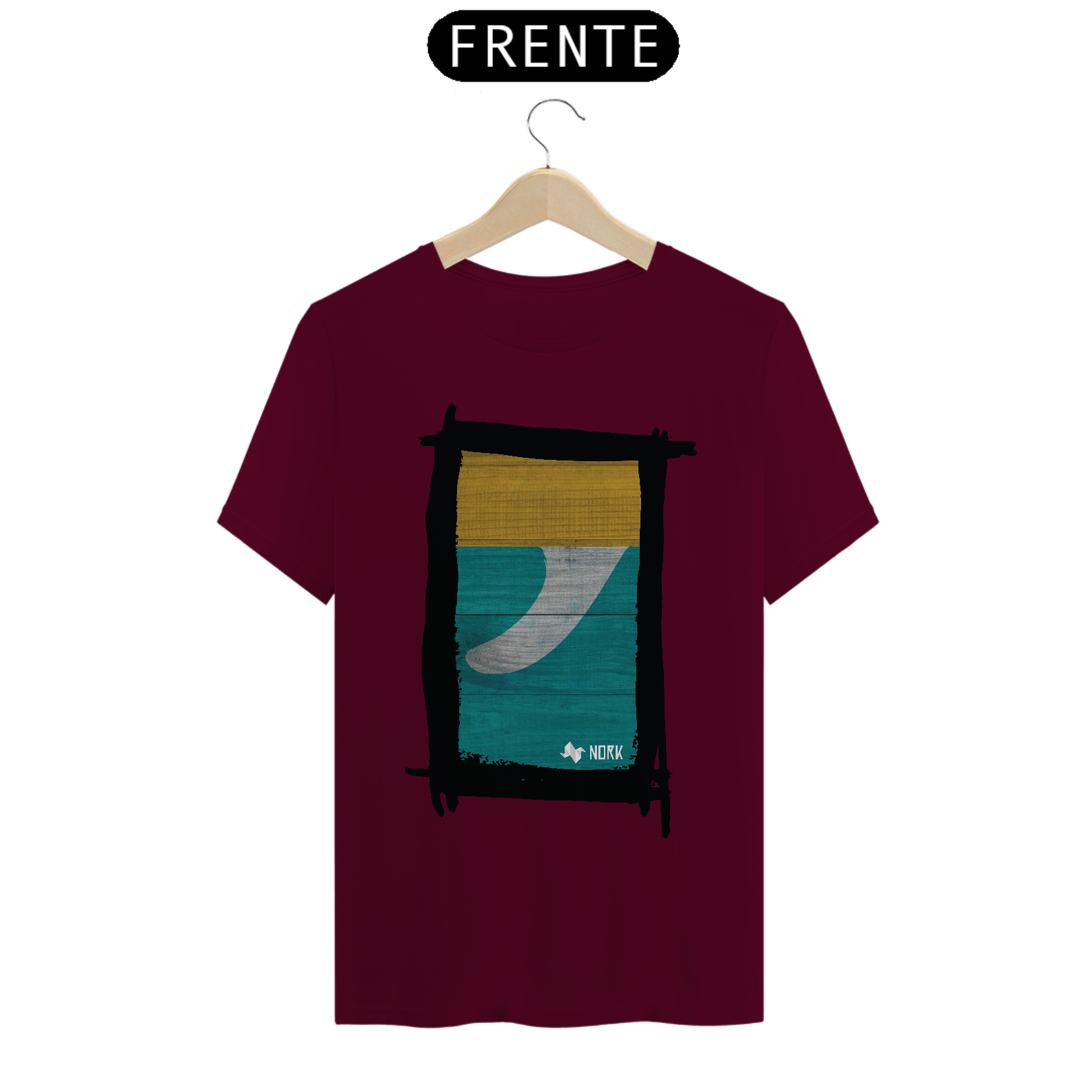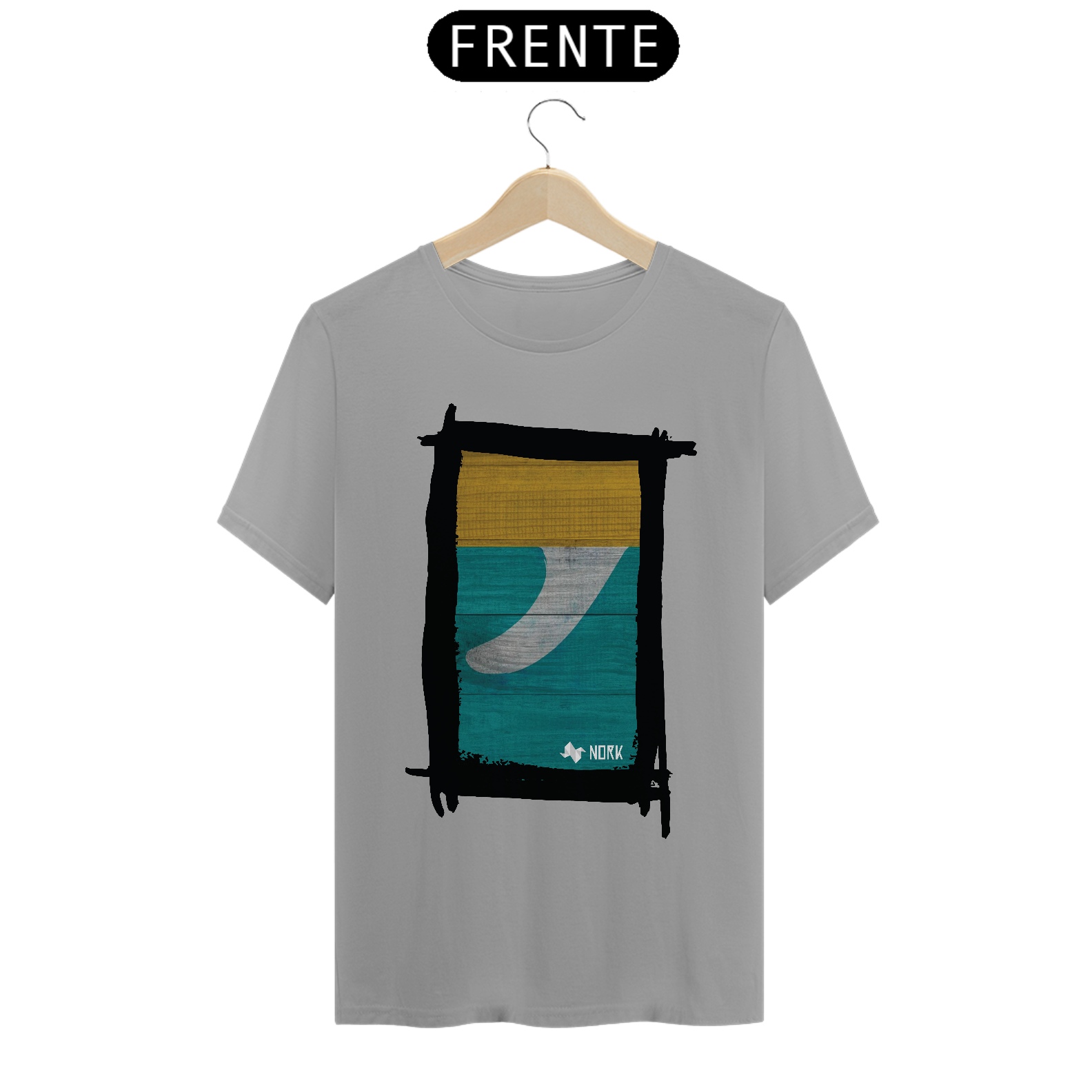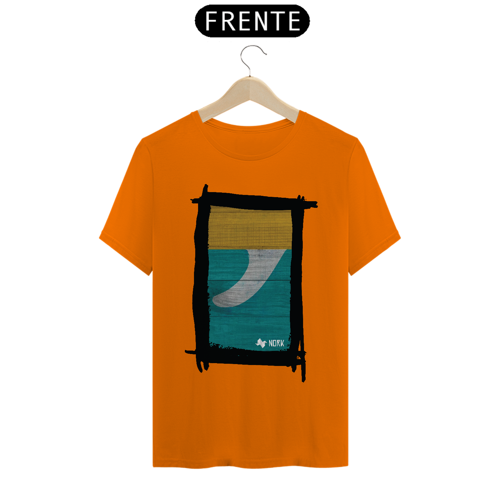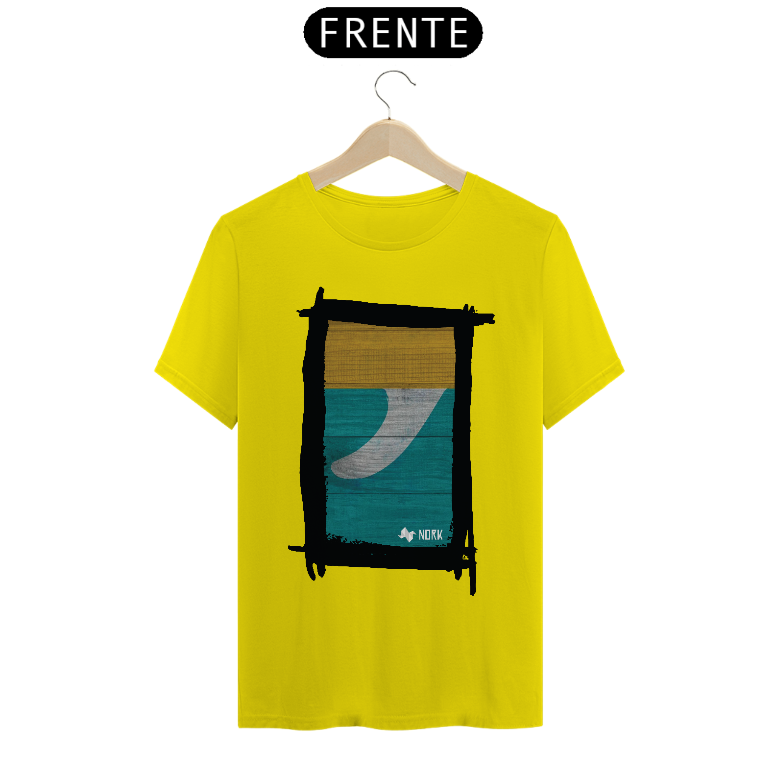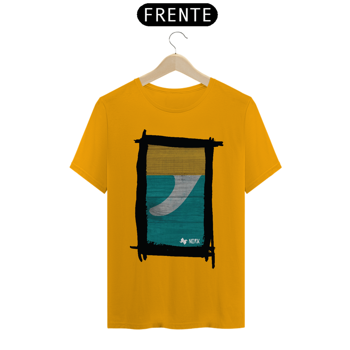 A camisa apresenta um design minimalista e marcante, inspirado na estética náutica e no estilo de vida praiano. A composição traz um fundo texturizado que lembra tábuas de madeira, dividido em faixas de cores complementares: um tom quente de amarelo na parte superior e um azul turquesa vibrante na parte inferior. Ao centro, um elemento gráfico em branco representa uma quilha de prancha de surfe, evocando simplicidade e autenticidade. O contraste entre as cores e a textura rústica do fundo cria uma peça visualmente equilibrada e moderna. O logo da Nork aparece discretamente na parte inferior, reforçando a identidade da marca sem interferir no design.