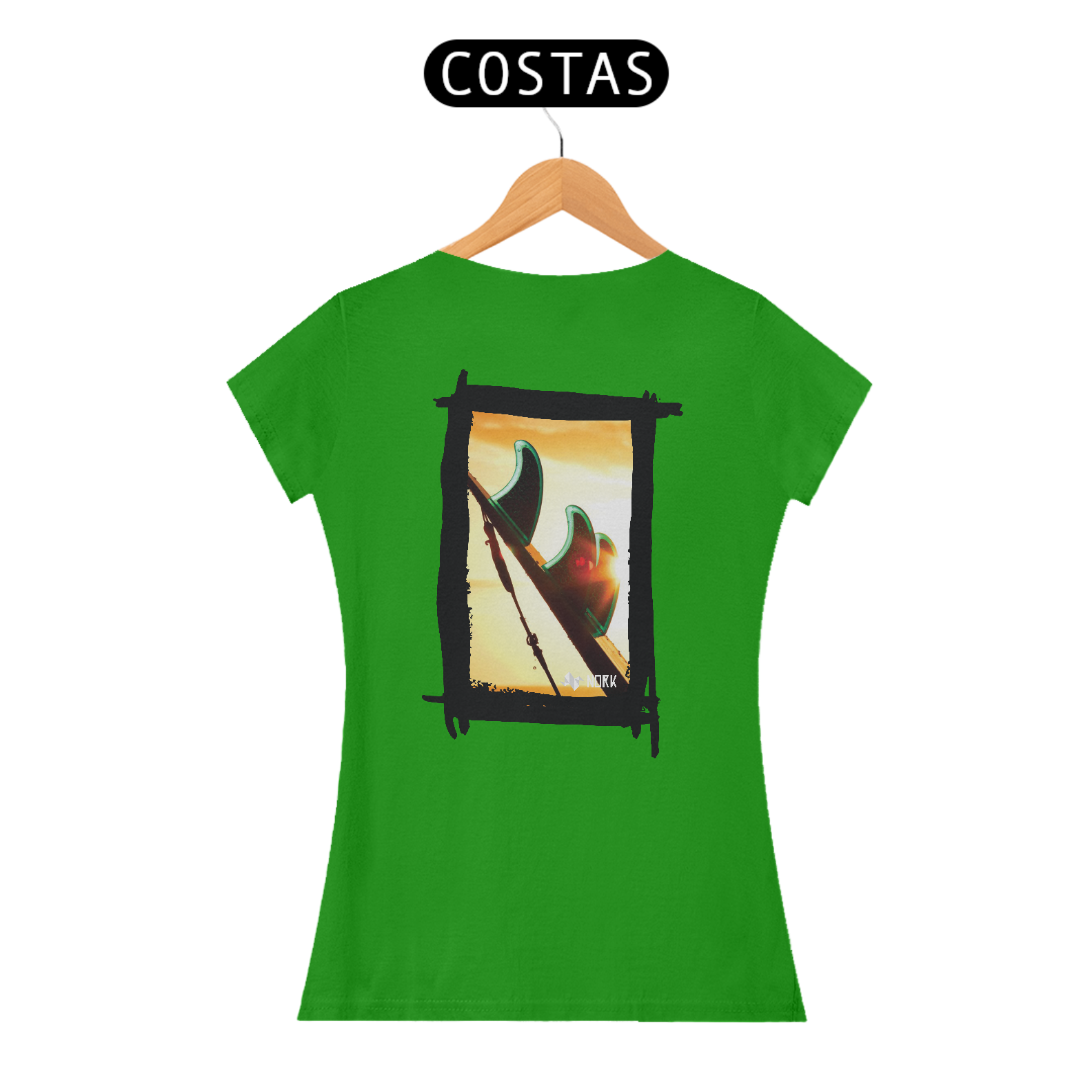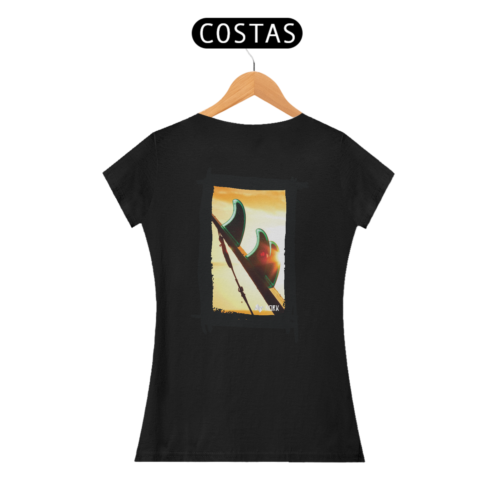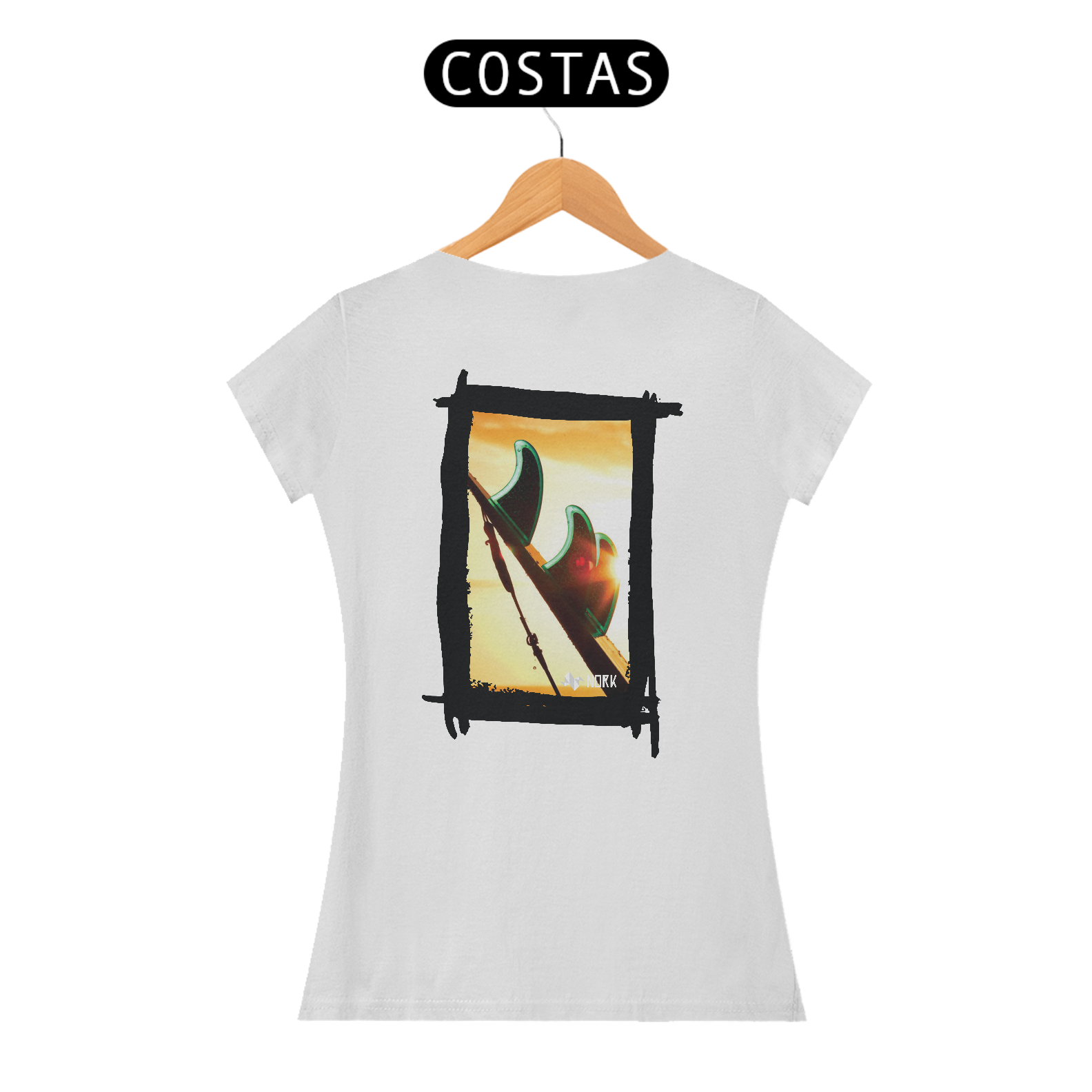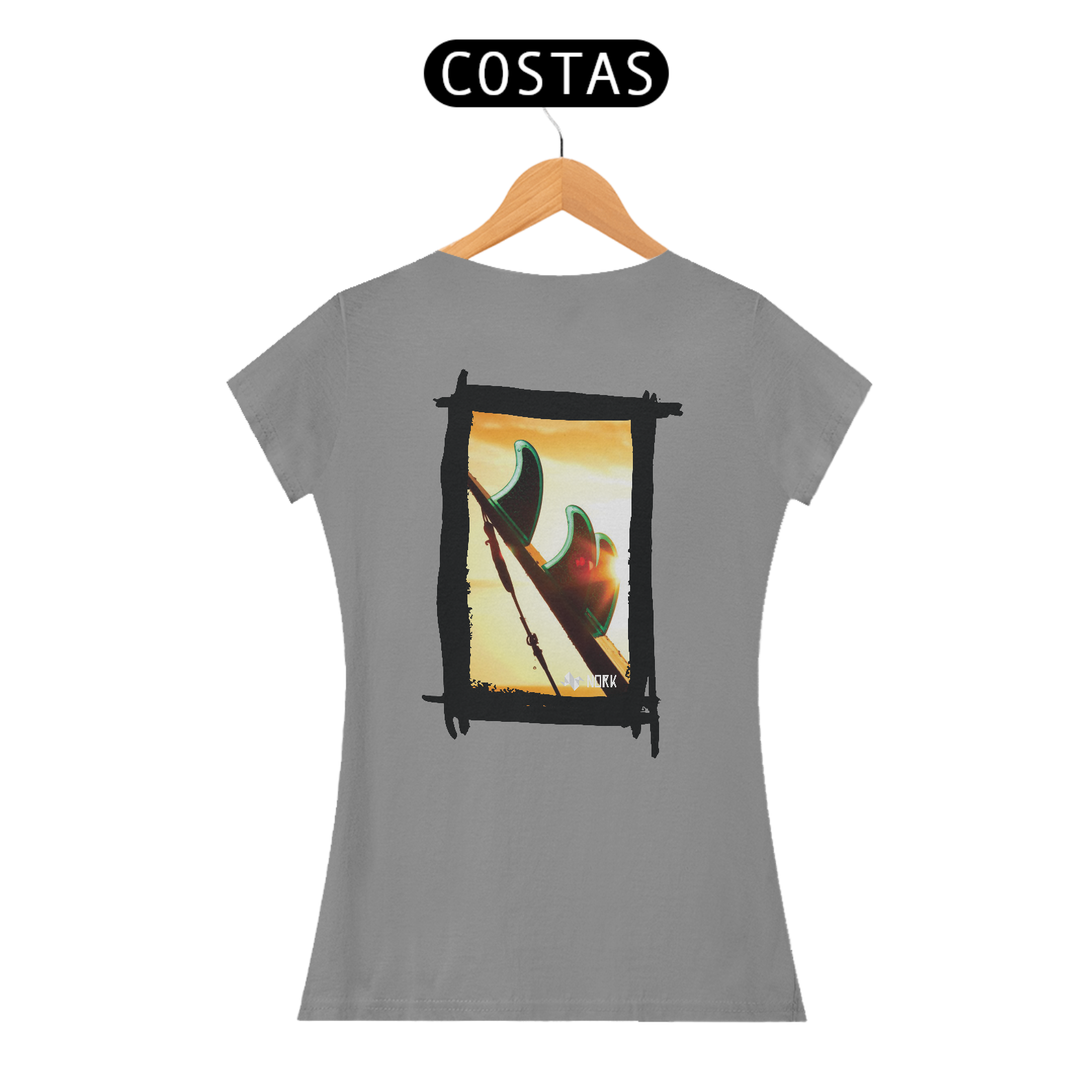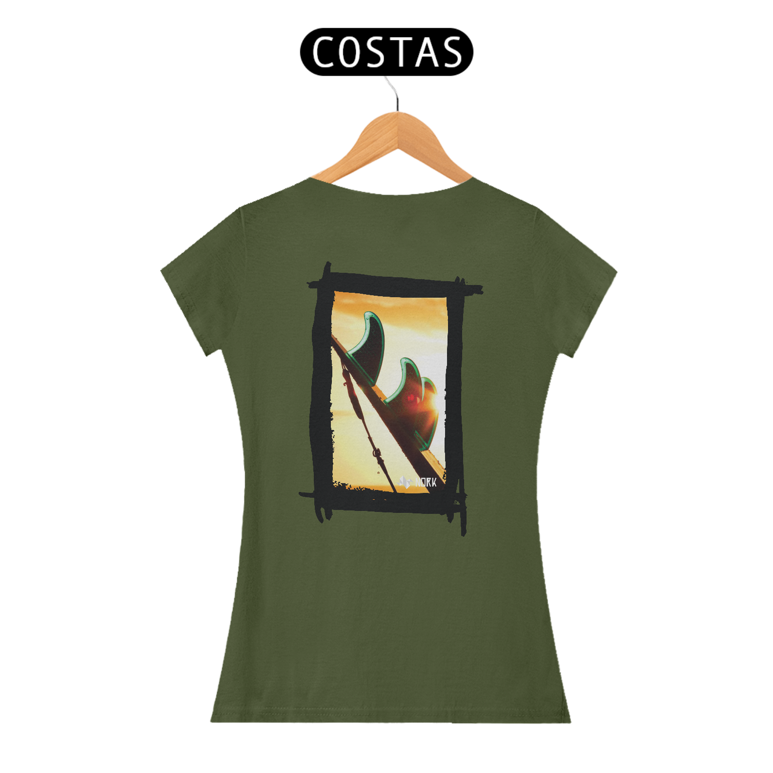 A camisa apresenta uma arte elegante e minimalista, destacando três quilhas de prancha de surfe iluminadas por um pôr do sol radiante. As quilhas em tons de verde translúcido criam um belo contraste com o fundo dourado e alaranjado do céu, evocando a sensação de liberdade e conexão com o oceano. O reflexo da luz solar nas superfícies adiciona um toque de brilho e dinamismo, enquanto os detalhes do leash e da prancha reforçam a autenticidade e o vínculo com o universo do surfe. O design é ideal para quem busca uma peça que une simplicidade, estilo e personalidade. O logo da Nork está posicionado de forma discreta na parte inferior, complementando o visual de maneira sofisticada.