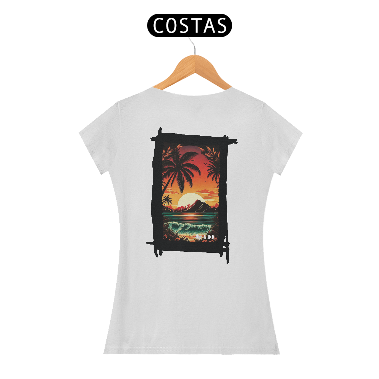 A camisa apresenta uma arte deslumbrante que captura a essência de um pôr do sol tropical, com cores intensas e vibrantes que vão do laranja profundo ao vermelho ardente, criando um contraste marcante com o azul esverdeado do mar. A composição é emoldurada por palmeiras estilizadas em silhueta preta, que adicionam profundidade e uma atmosfera relaxante à cena. Ao fundo, uma montanha escura contrasta com o brilho do sol poente refletido na água, enquanto ondas suaves e detalhadas trazem movimento e vivacidade ao design. O visual exala tranquilidade e uma conexão com a natureza exuberante. O logo da Nork aparece discretamente na parte inferior, preservando a exclusividade da peça.