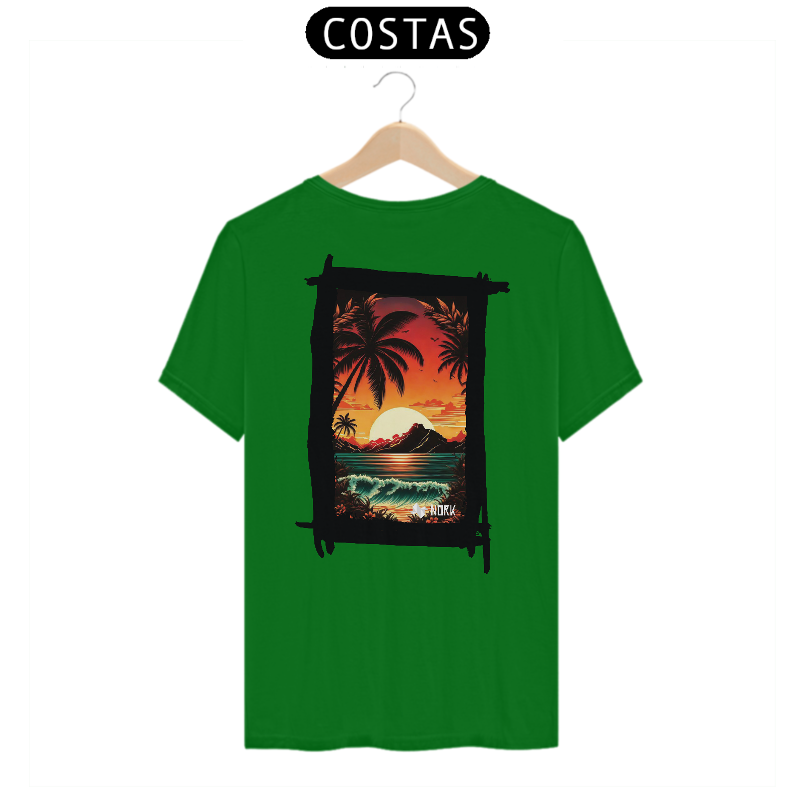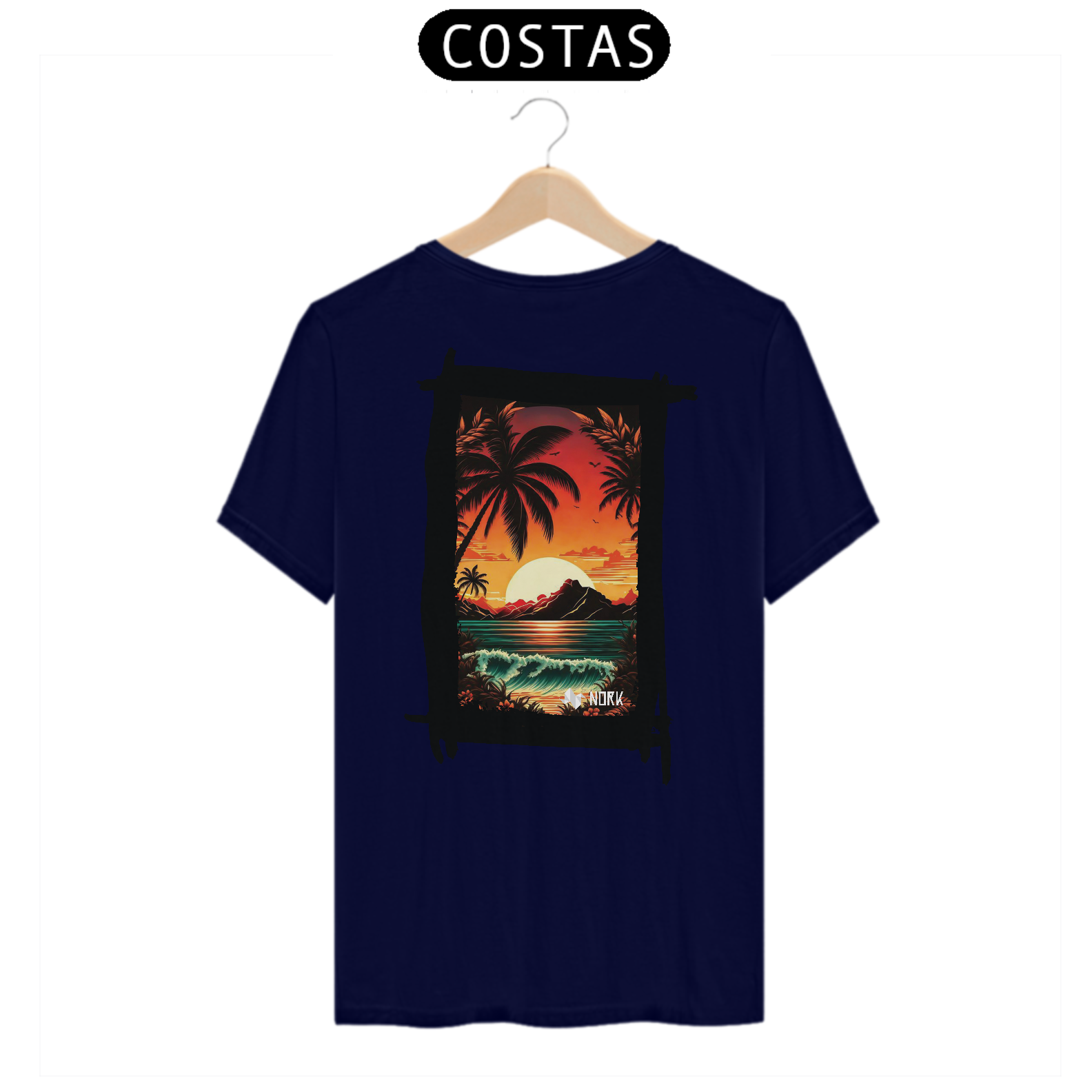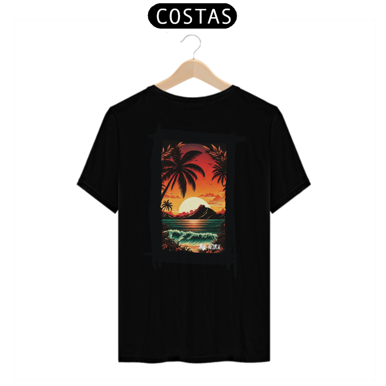 A camisa apresenta uma arte deslumbrante que captura a essência de um pôr do sol tropical, com cores intensas e vibrantes que vão do laranja profundo ao vermelho ardente, criando um contraste marcante com o azul esverdeado do mar. A composição é emoldurada por palmeiras estilizadas em silhueta preta, que adicionam profundidade e uma atmosfera relaxante à cena. Ao fundo, uma montanha escura contrasta com o brilho do sol poente refletido na água, enquanto ondas suaves e detalhadas trazem movimento e vivacidade ao design. O visual exala tranquilidade e uma conexão com a natureza exuberante. O logo da Nork aparece discretamente na parte inferior, preservando a exclusividade da peça.