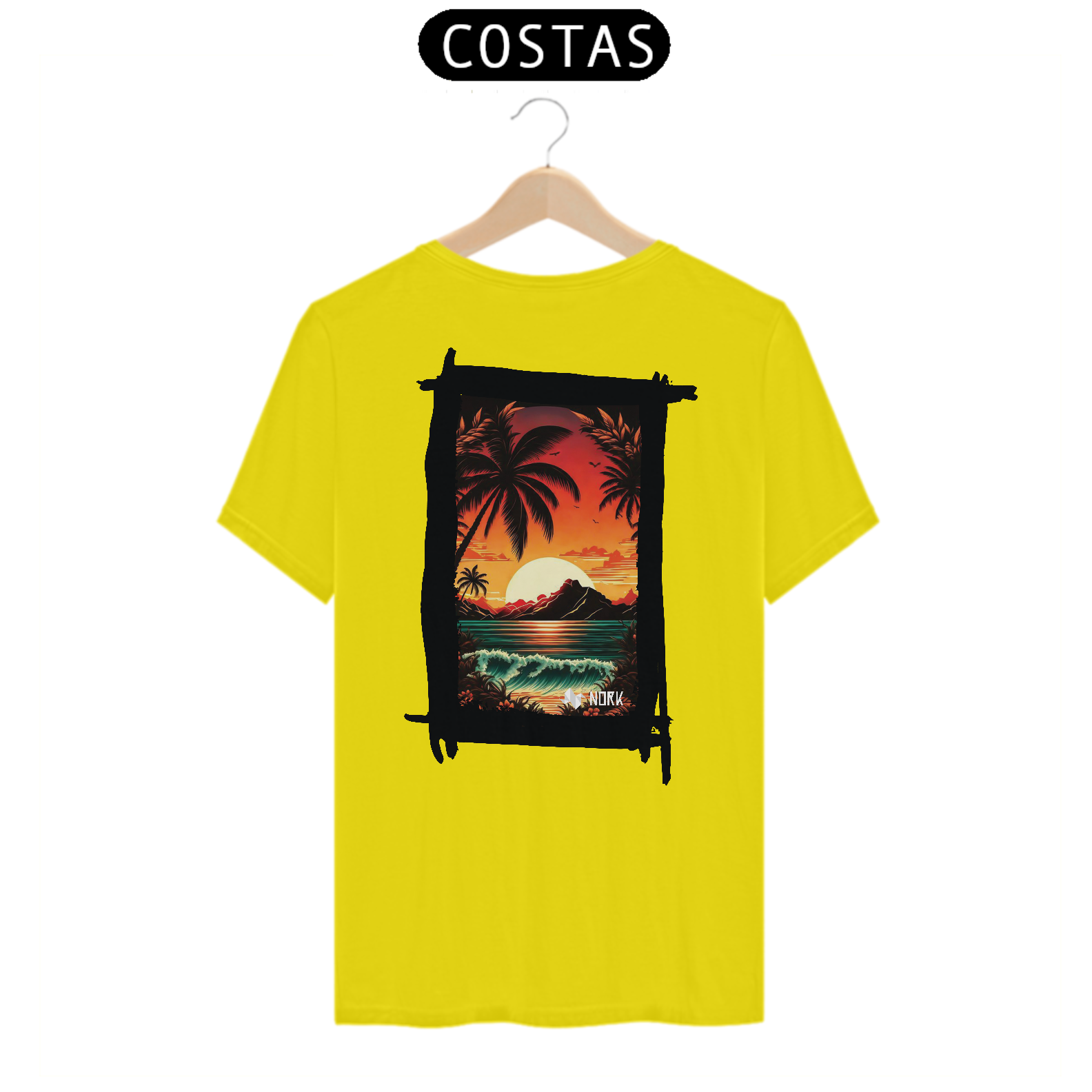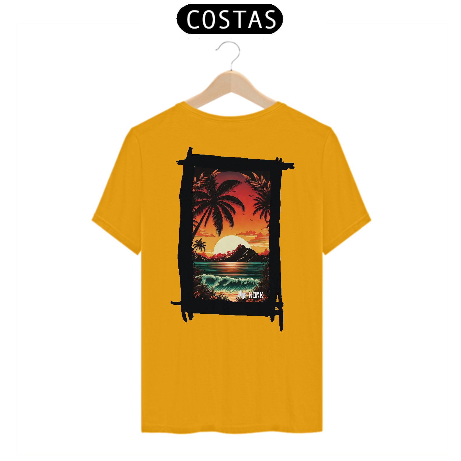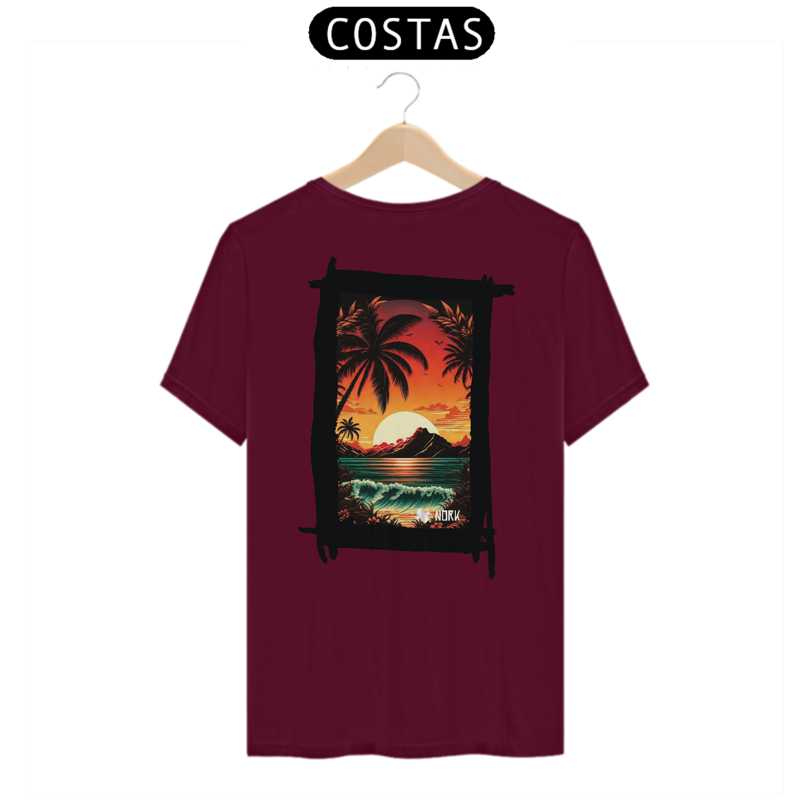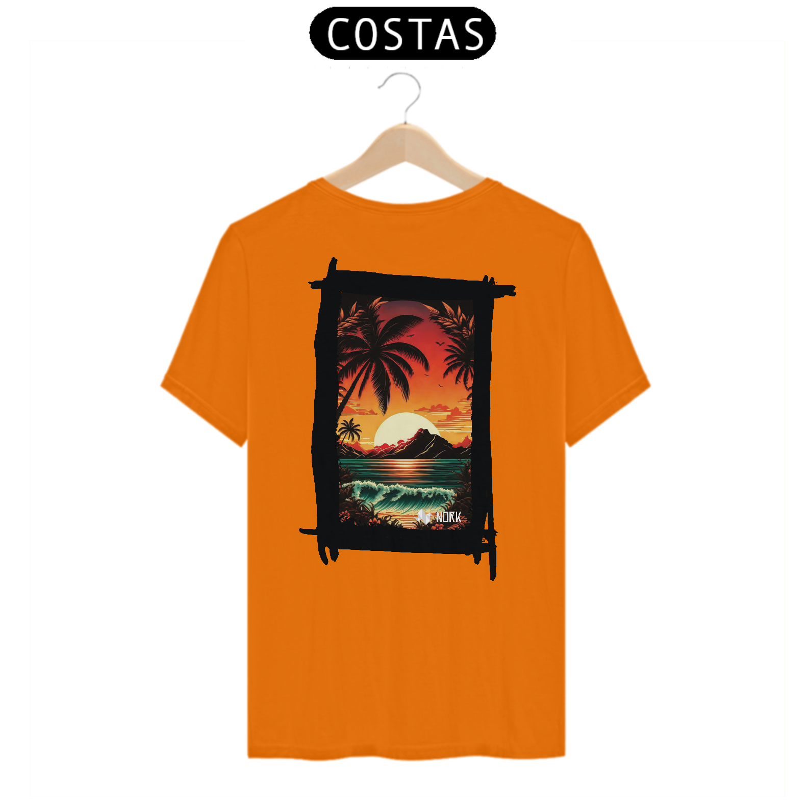 A camisa apresenta uma arte deslumbrante que captura a essência de um pôr do sol tropical, com cores intensas e vibrantes que vão do laranja profundo ao vermelho ardente, criando um contraste marcante com o azul esverdeado do mar. A composição é emoldurada por palmeiras estilizadas em silhueta preta, que adicionam profundidade e uma atmosfera relaxante à cena. Ao fundo, uma montanha escura contrasta com o brilho do sol poente refletido na água, enquanto ondas suaves e detalhadas trazem movimento e vivacidade ao design. O visual exala tranquilidade e uma conexão com a natureza exuberante. O logo da Nork aparece discretamente na parte inferior, preservando a exclusividade da peça.