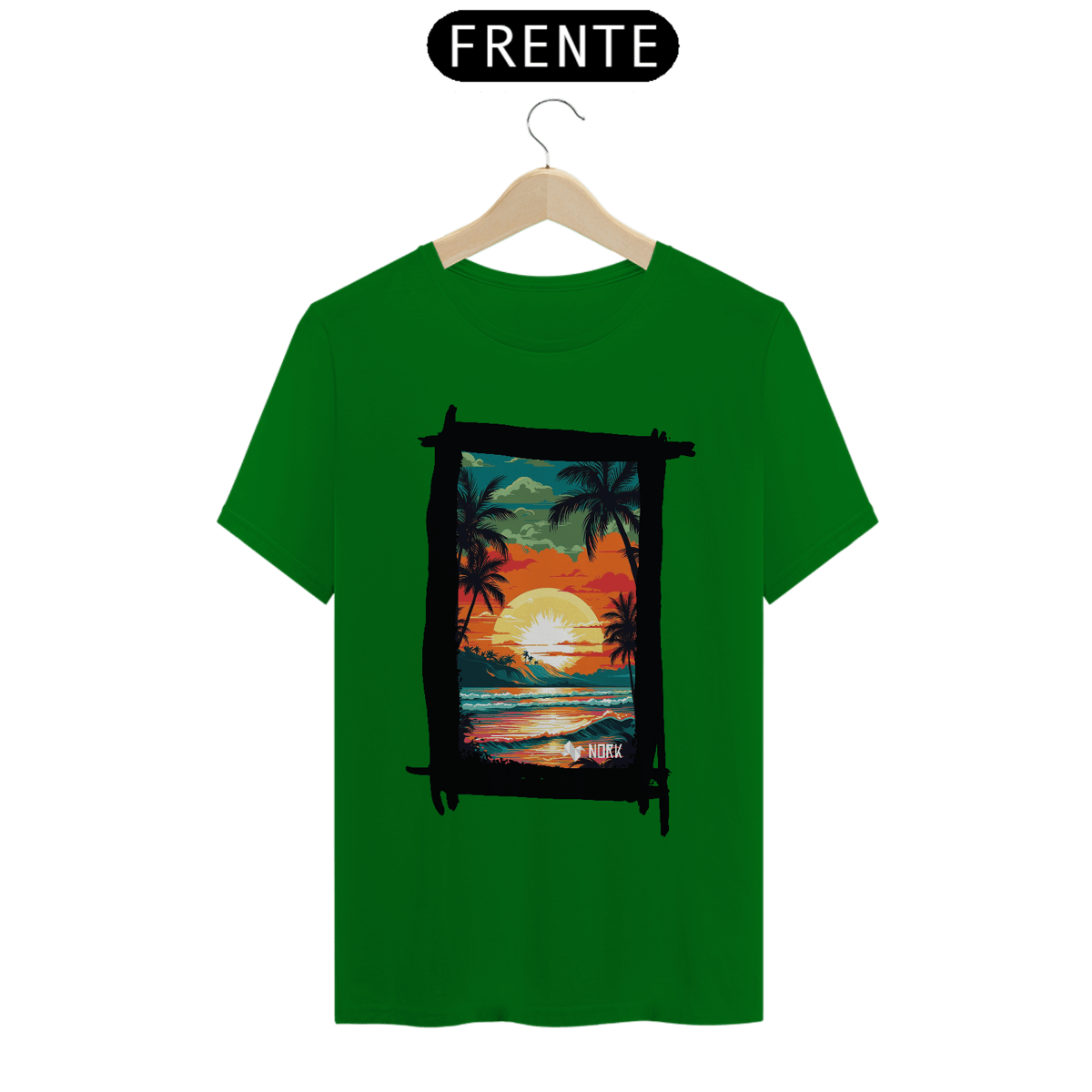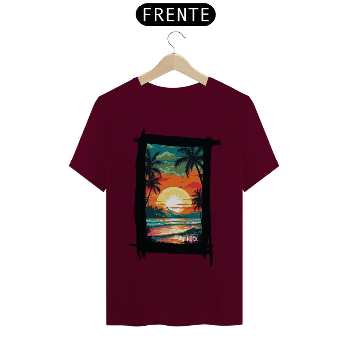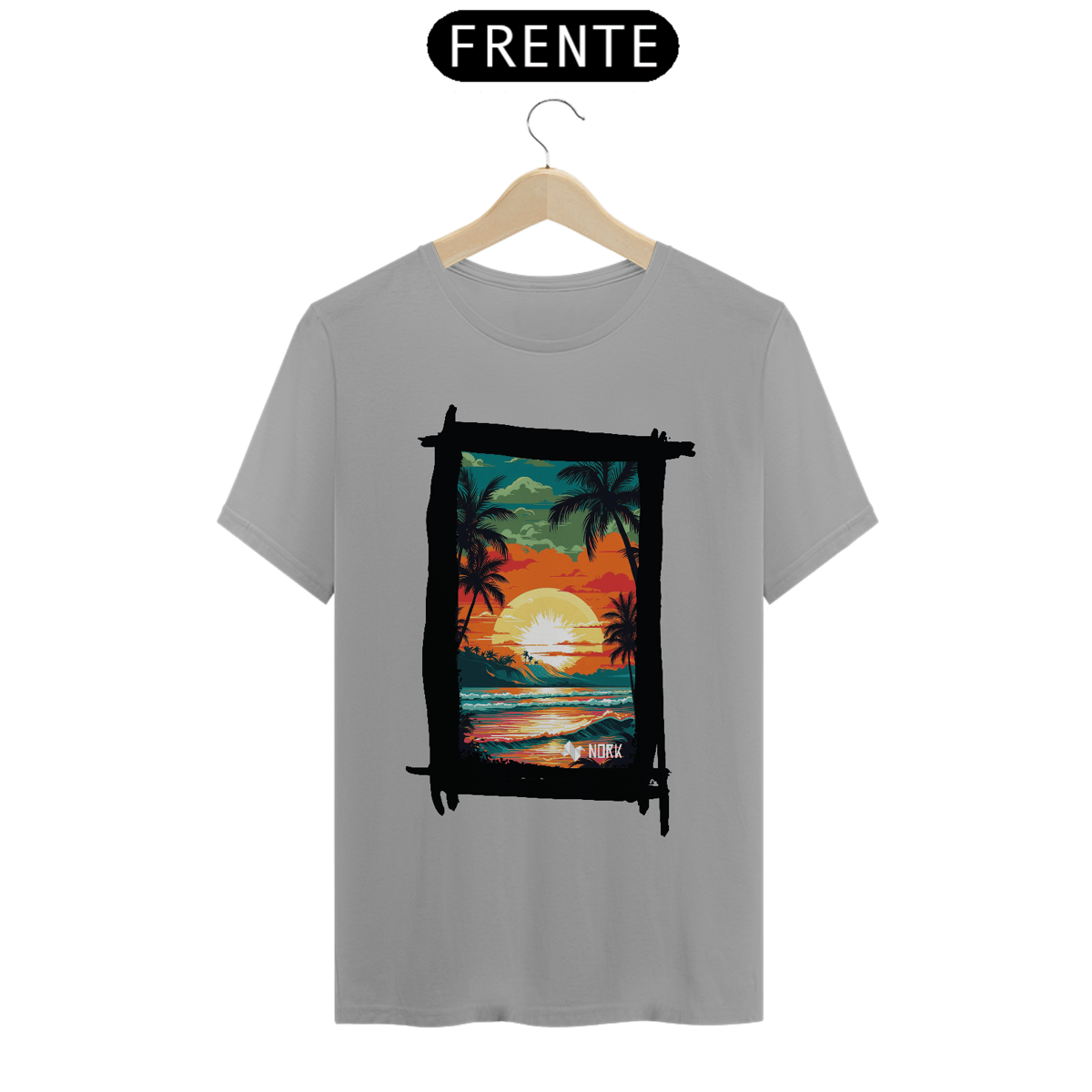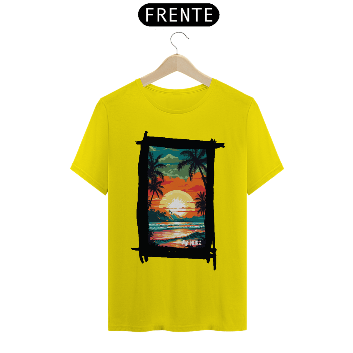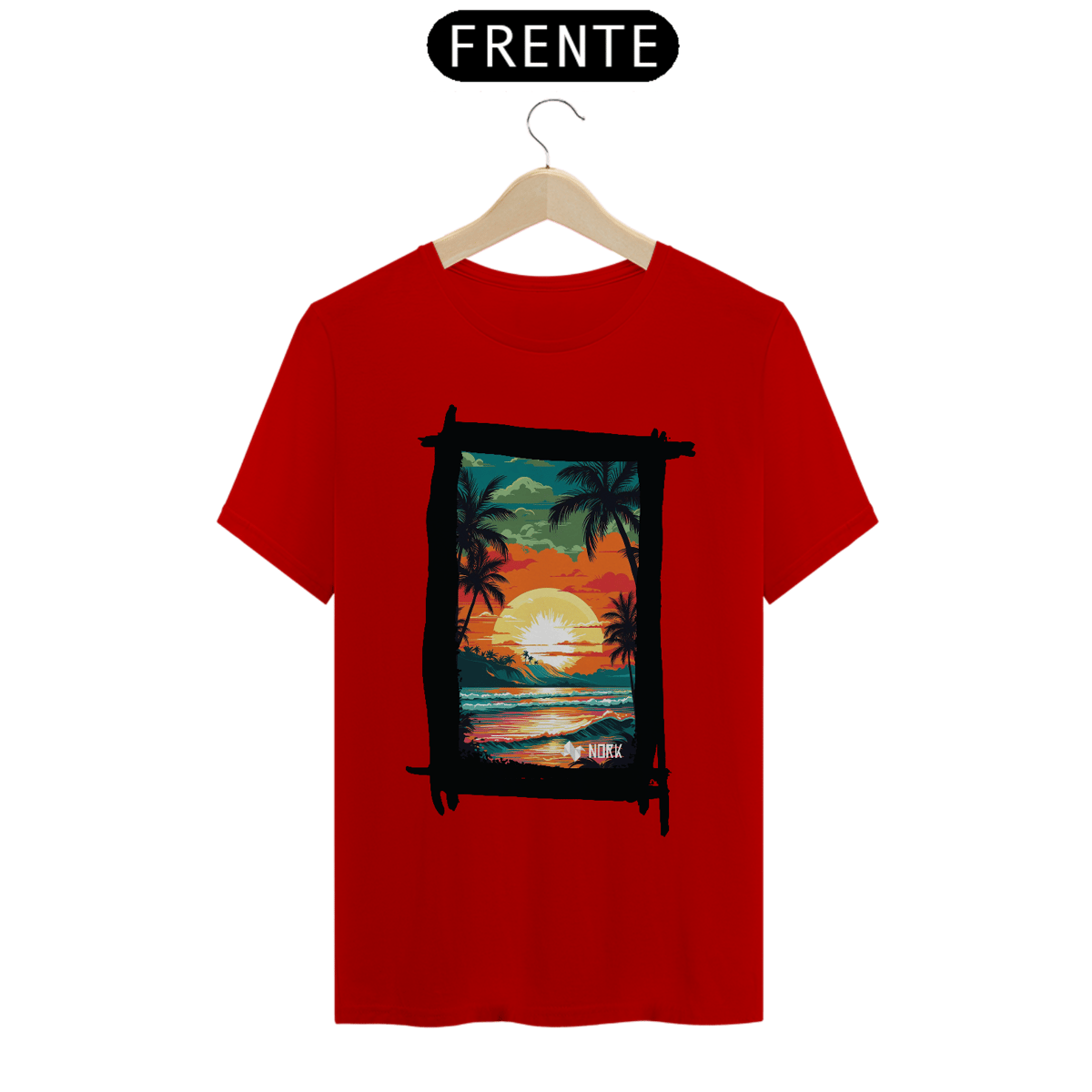 A camisa apresenta uma arte vibrante e cheia de vida, retratando um pôr do sol tropical que destaca a beleza de uma paisagem praiana. O design combina cores intensas como laranja, vermelho, amarelo e verde, criando uma cena marcante e nostálgica. No centro, o sol radiante ilumina o céu, enquanto suas reflexões se espalham pelo oceano, capturando a essência de um dia perfeito no paraíso. Palmeiras silhuetadas em preto adicionam um contraste elegante, evocando tranquilidade e um espírito relaxado, enquanto a composição geral sugere uma conexão íntima com a natureza. O logo da Nork aparece discretamente na parte inferior, reforçando a identidade da marca.
