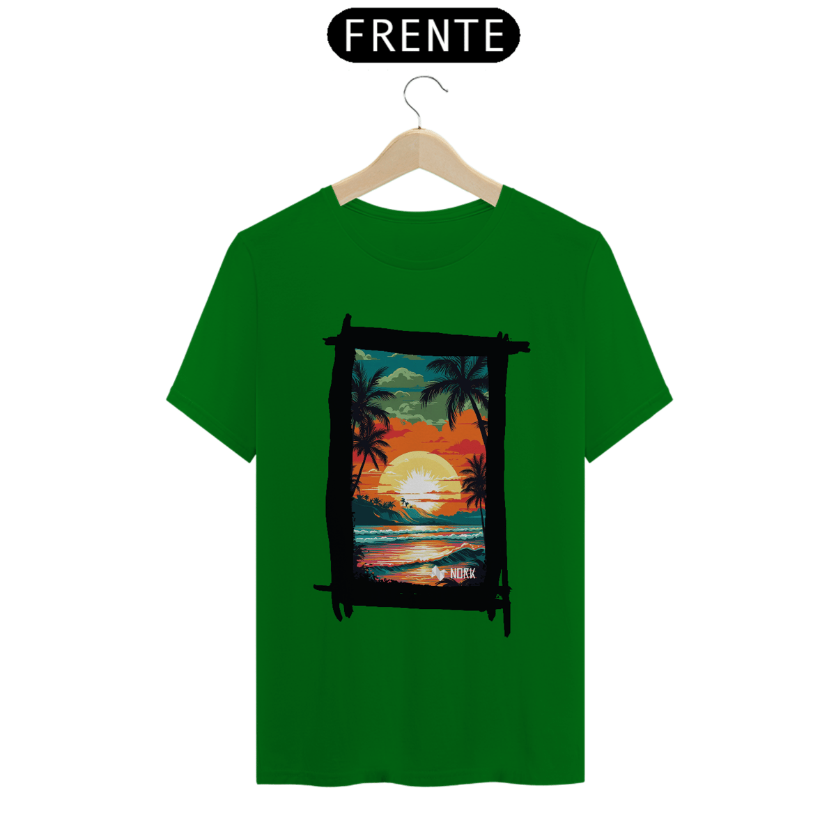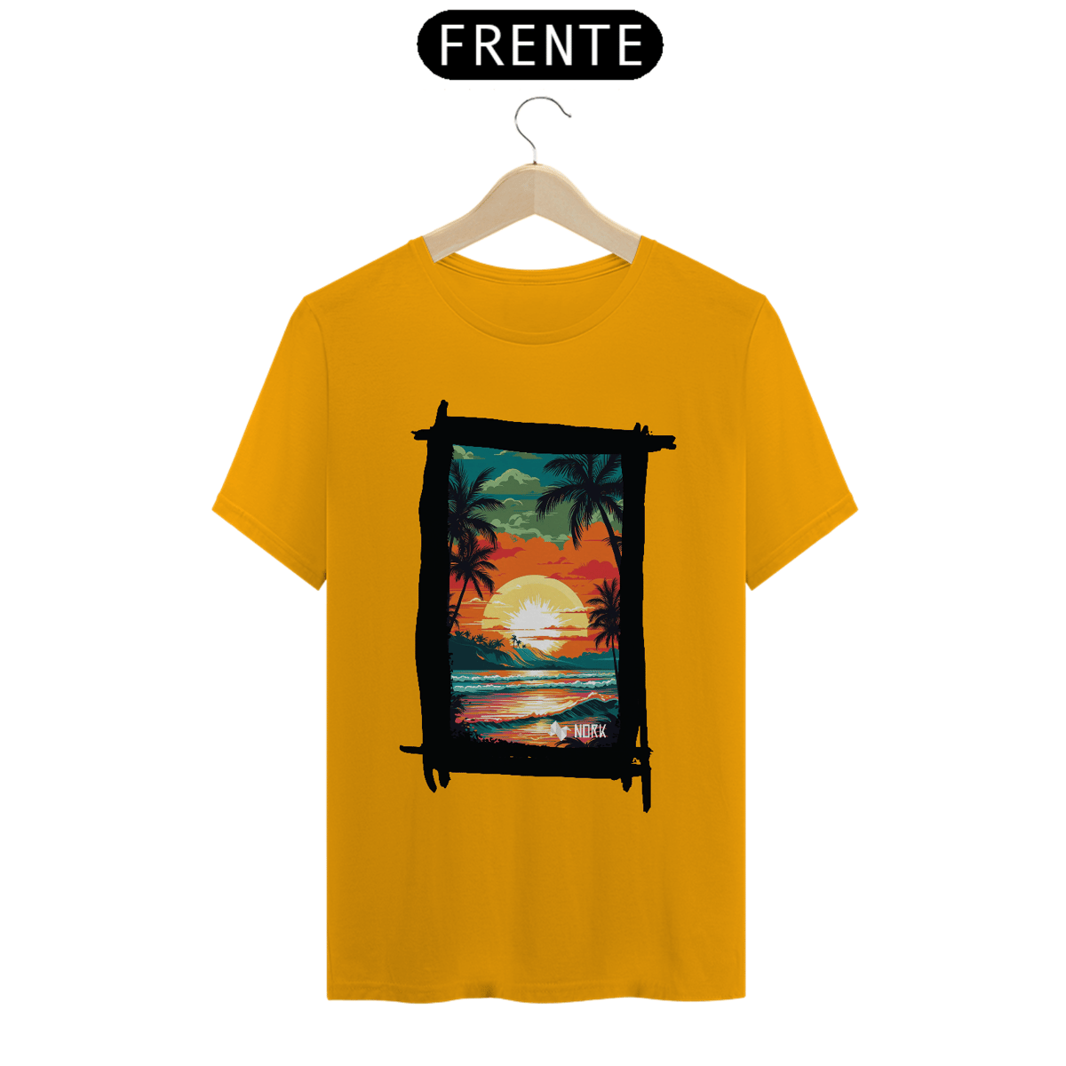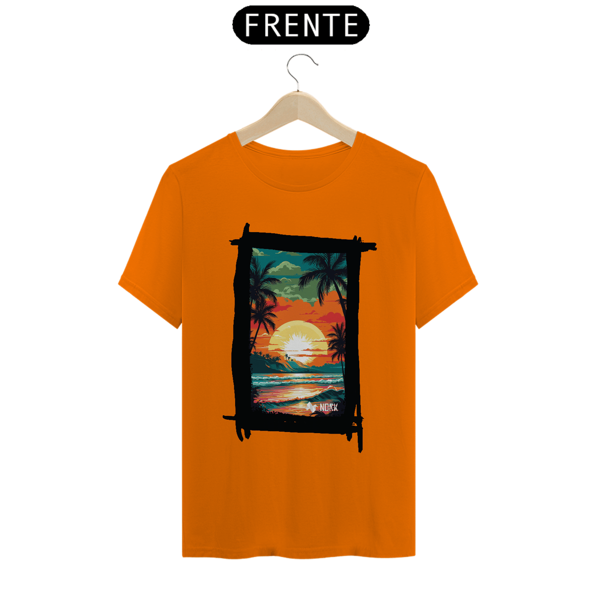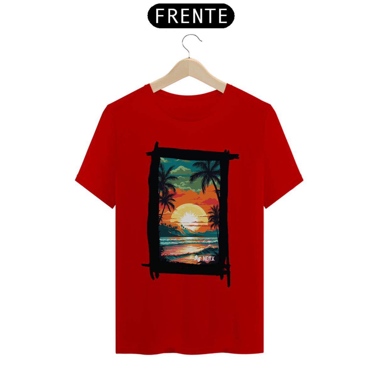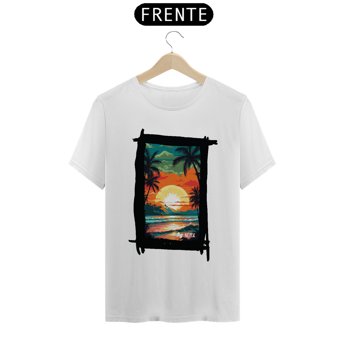 A camisa apresenta uma arte vibrante e cheia de vida, retratando um pôr do sol tropical que destaca a beleza de uma paisagem praiana. O design combina cores intensas como laranja, vermelho, amarelo e verde, criando uma cena marcante e nostálgica. No centro, o sol radiante ilumina o céu, enquanto suas reflexões se espalham pelo oceano, capturando a essência de um dia perfeito no paraíso. Palmeiras silhuetadas em preto adicionam um contraste elegante, evocando tranquilidade e um espírito relaxado, enquanto a composição geral sugere uma conexão íntima com a natureza. O logo da Nork aparece discretamente na parte inferior, reforçando a identidade da marca.