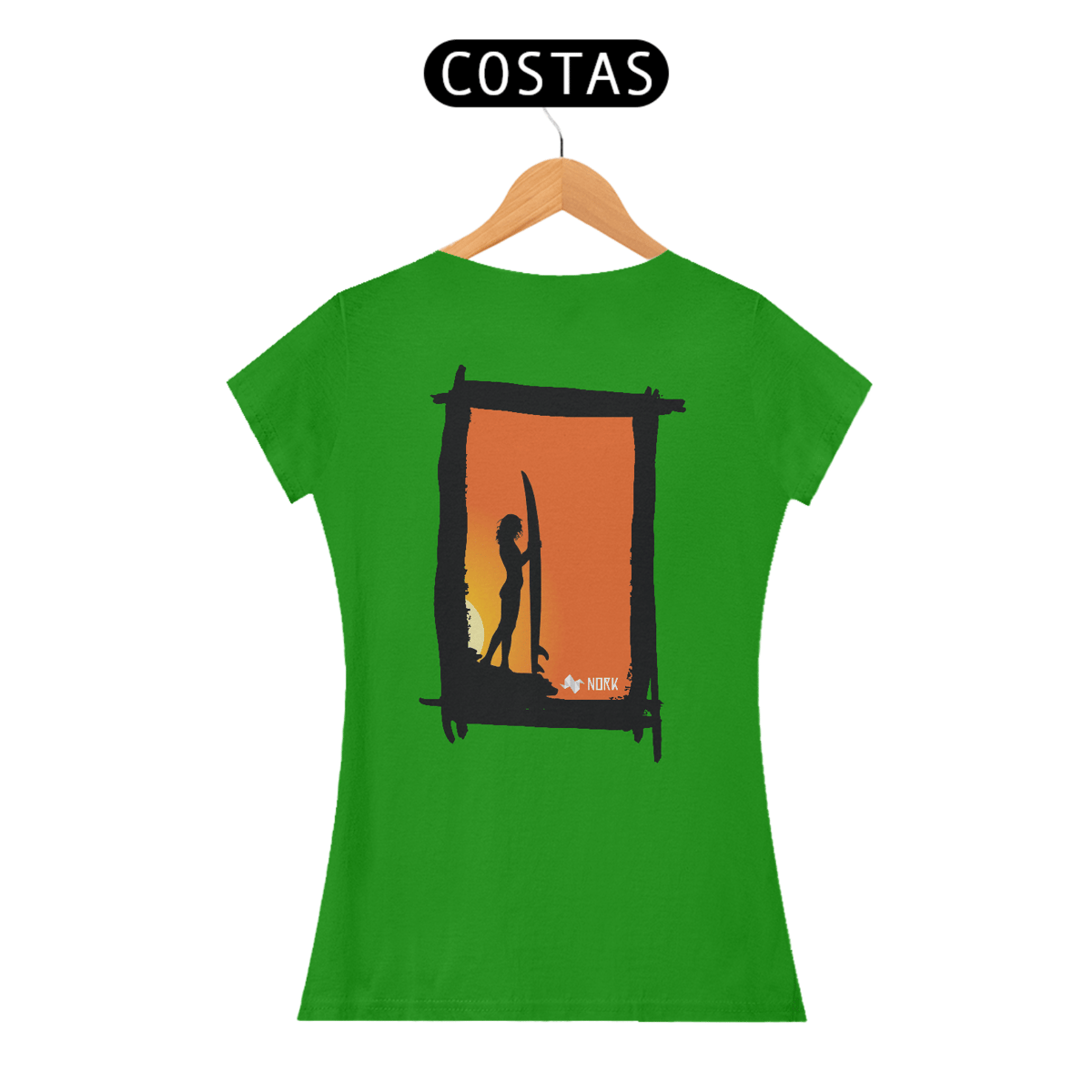 A camisa apresenta um design minimalista e elegante, destacando a silhueta de uma mulher segurando uma prancha de surfe contra um fundo em tons quentes de laranja e amarelo, que evocam o pôr do sol. A composição simples e impactante transmite tranquilidade e força, representando a conexão com o oceano e a liberdade do estilo de vida surfista. O contraste entre a figura preta e o fundo vibrante cria uma peça visualmente marcante e atemporal. O logo da Nork está posicionado discretamente na parte inferior, complementando o design com sofisticação.