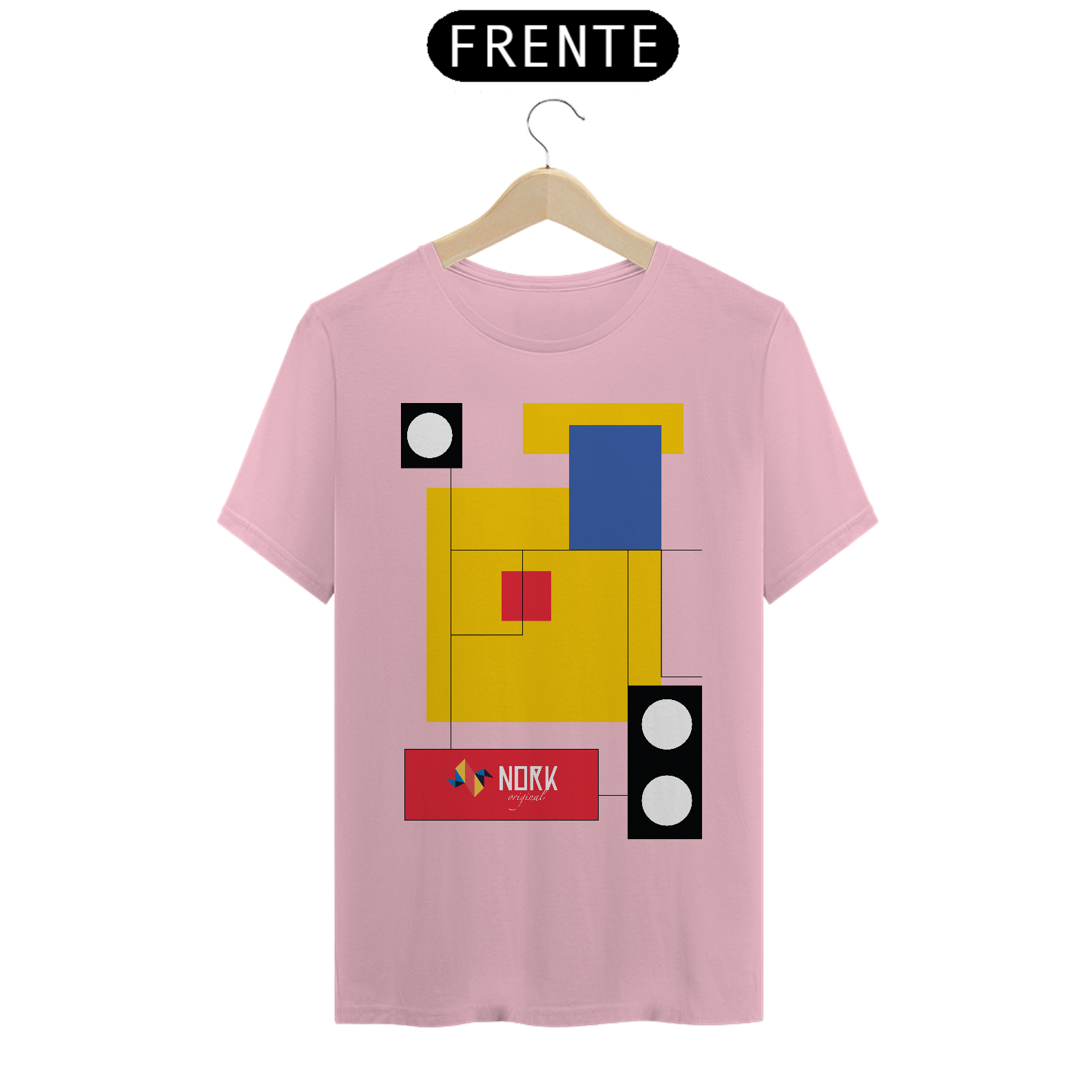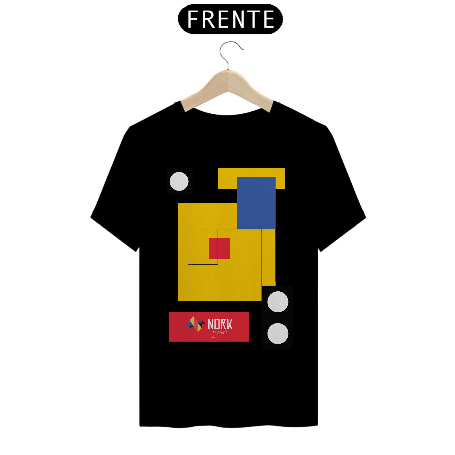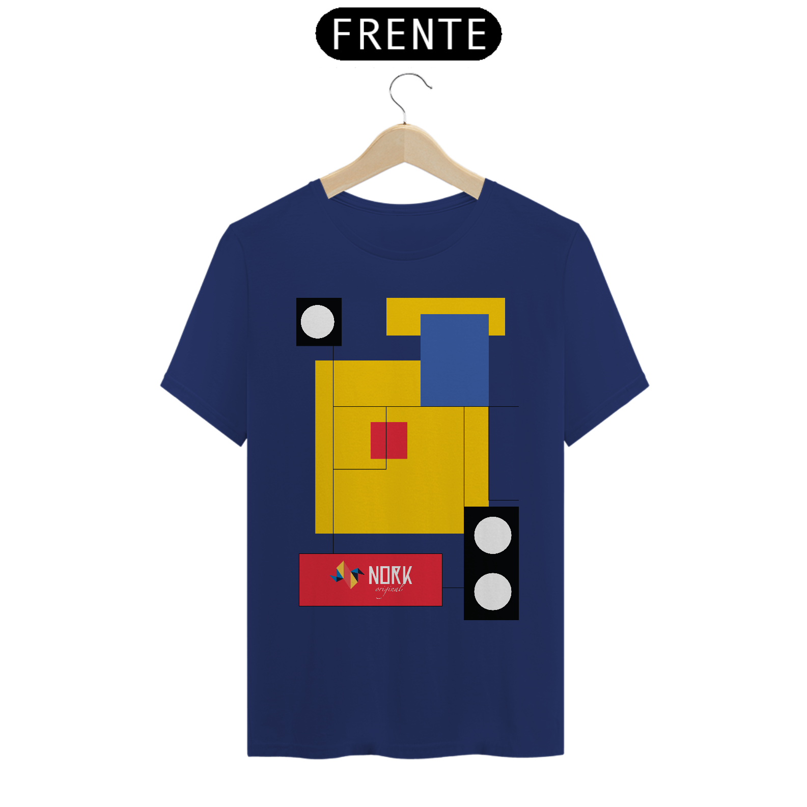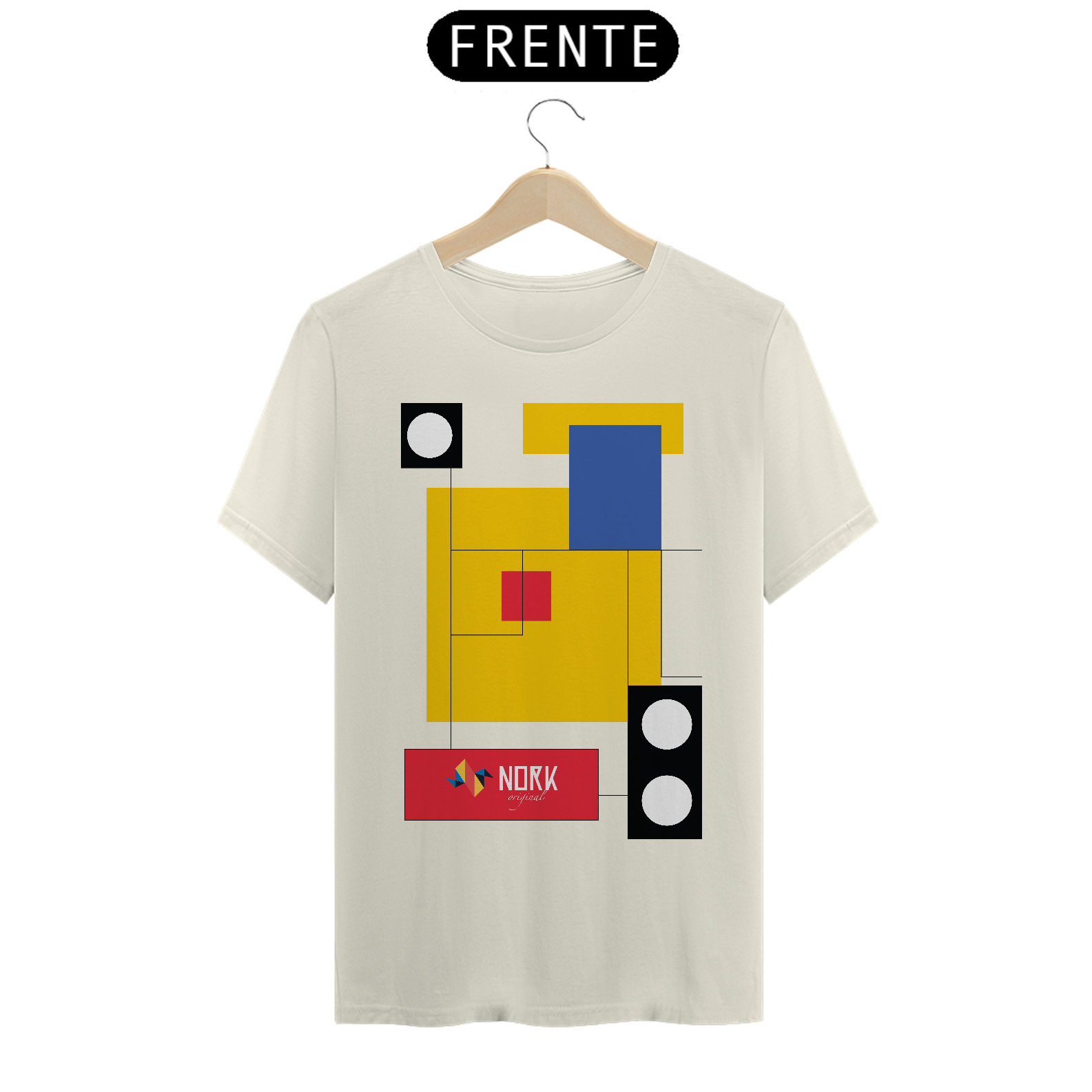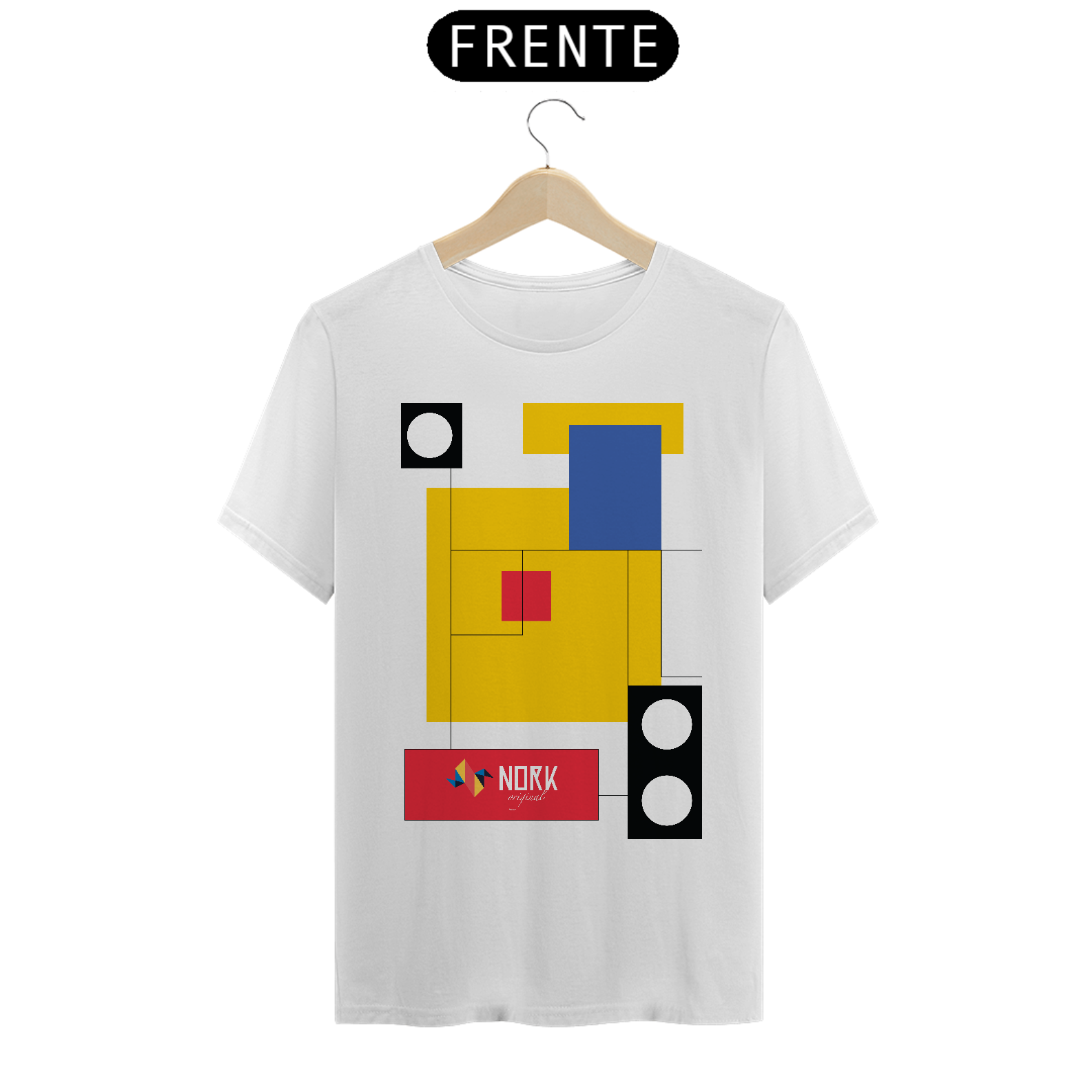 Esta camisa marcante da Coleção Nork Bauhaus apresenta um arranjo geométrico onde blocos de cor em amarelo, azul, vermelho e preto se conectam por finas linhas retas, criando um visual limpo e arrojado. As sobreposições retangulares, contrastadas por círculos em preto e branco, remetem à busca pelo equilíbrio entre forma e função, típica do movimento Bauhaus. O logo Nork Original em um retângulo vermelho traz destaque e identidade, reforçando o aspecto vanguardista da composição.