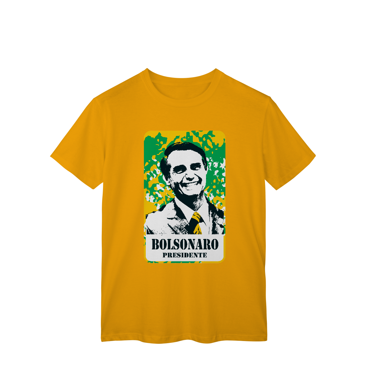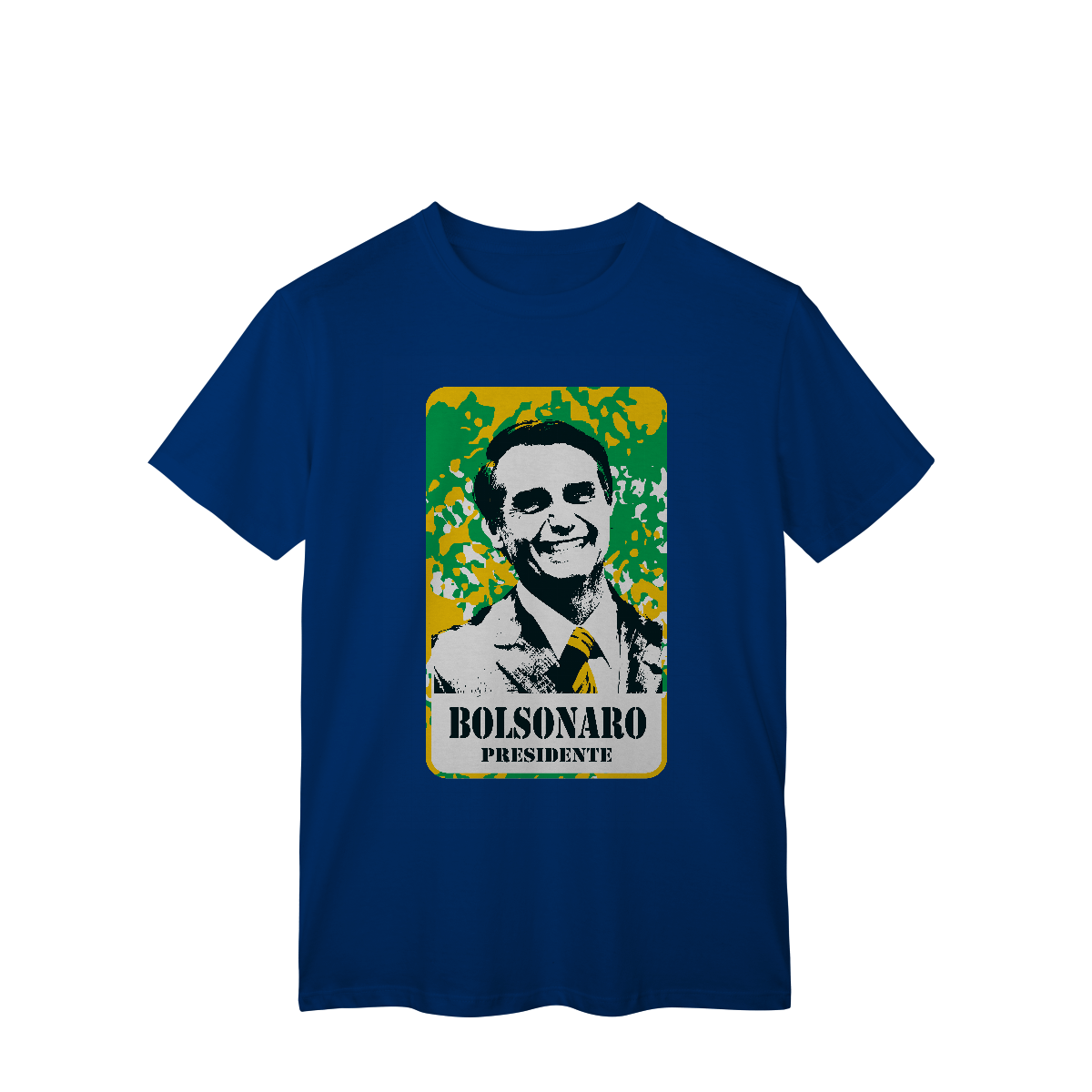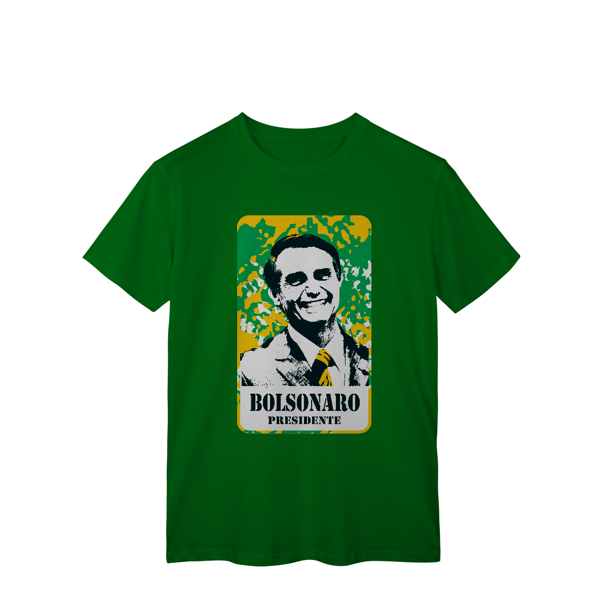 Uma explosão de cor e ideologia. A estampa “Cartaz Patriota” é uma releitura gráfica no estilo pop político, onde a imagem de Bolsonaro aparece com traços marcados e alto contraste, sobre um fundo de camuflagem que mistura verde, amarelo e branco, remetendo diretamente à estética nacionalista brasileira.
