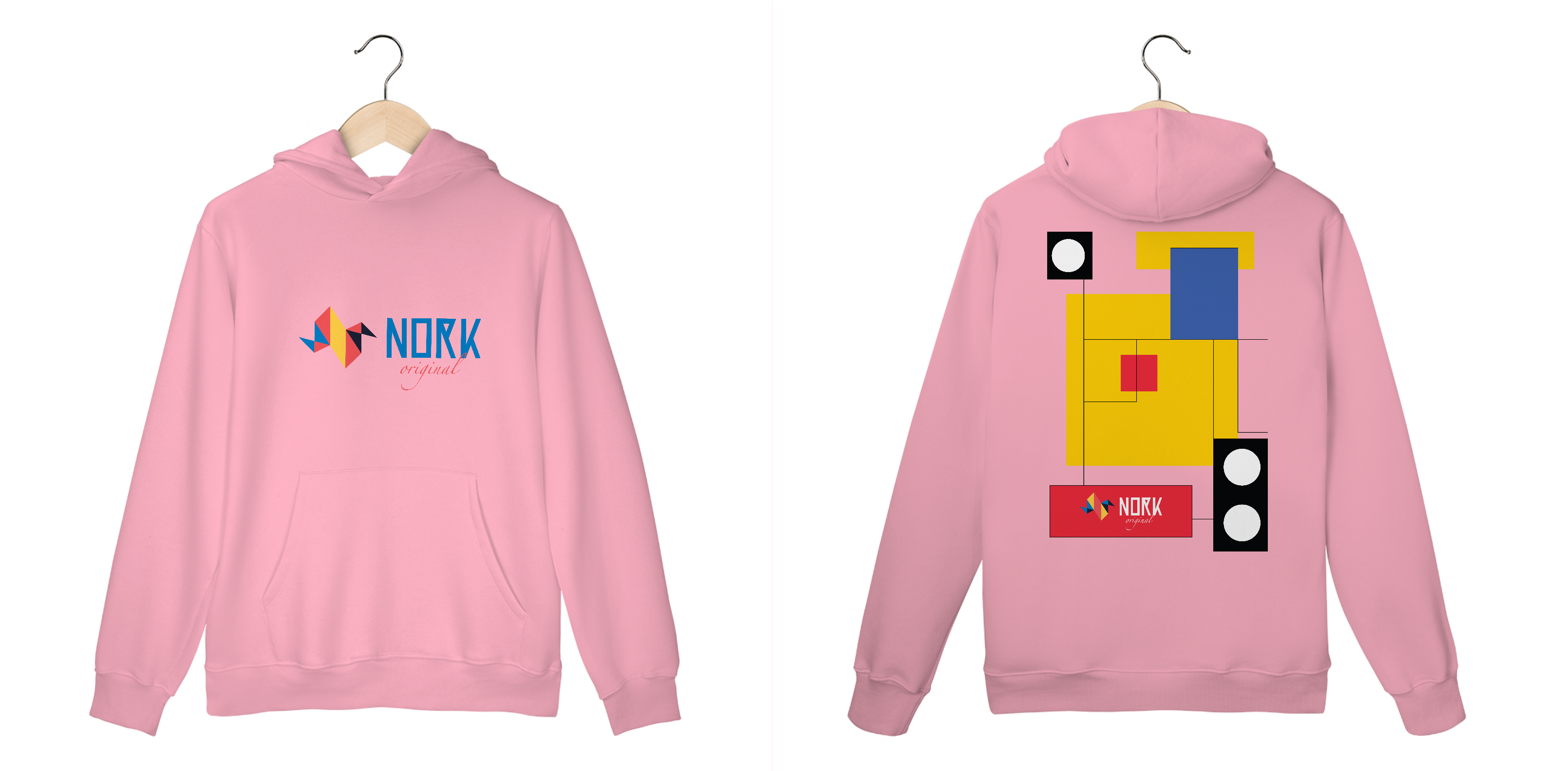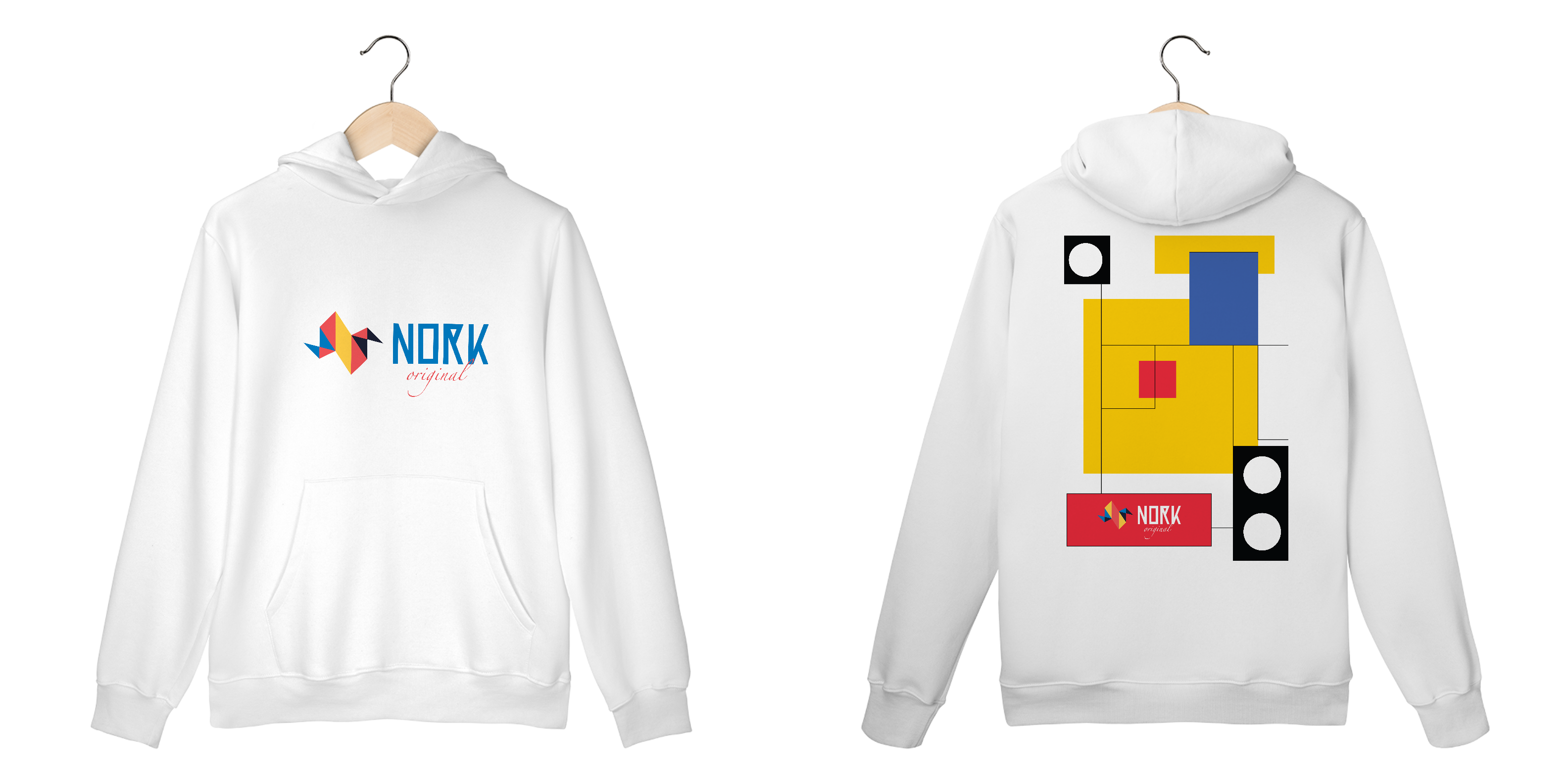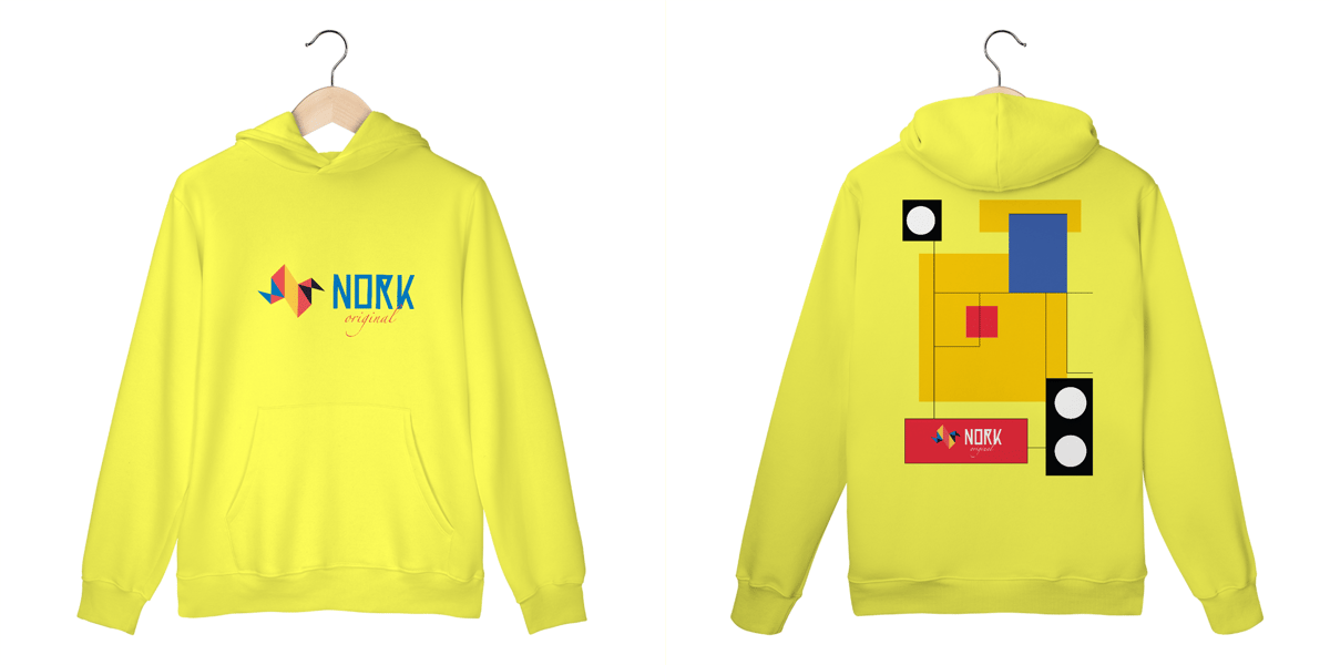 Coleção Nork Bauhaus apresenta um arranjo geométrico onde blocos de cor em amarelo, azul, vermelho e preto se conectam por finas linhas retas, criando um visual limpo e arrojado. As sobreposições retangulares, contrastadas por círculos em preto e branco, remetem à busca pelo equilíbrio entre forma e função, típica do movimento Bauhaus. O logo Nork Original em um retângulo vermelho traz destaque e identidade, reforçando o aspecto vanguardista da composição.