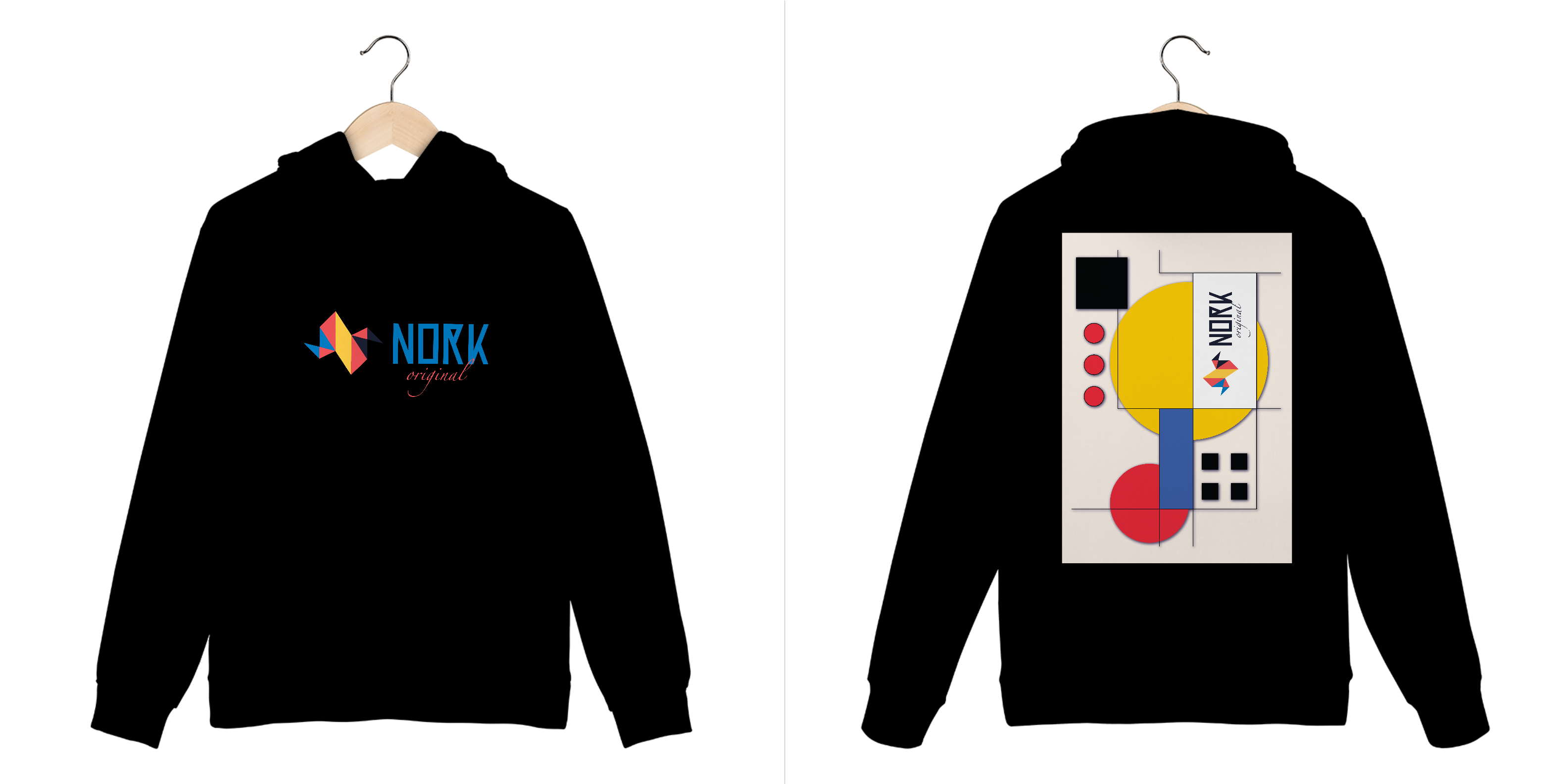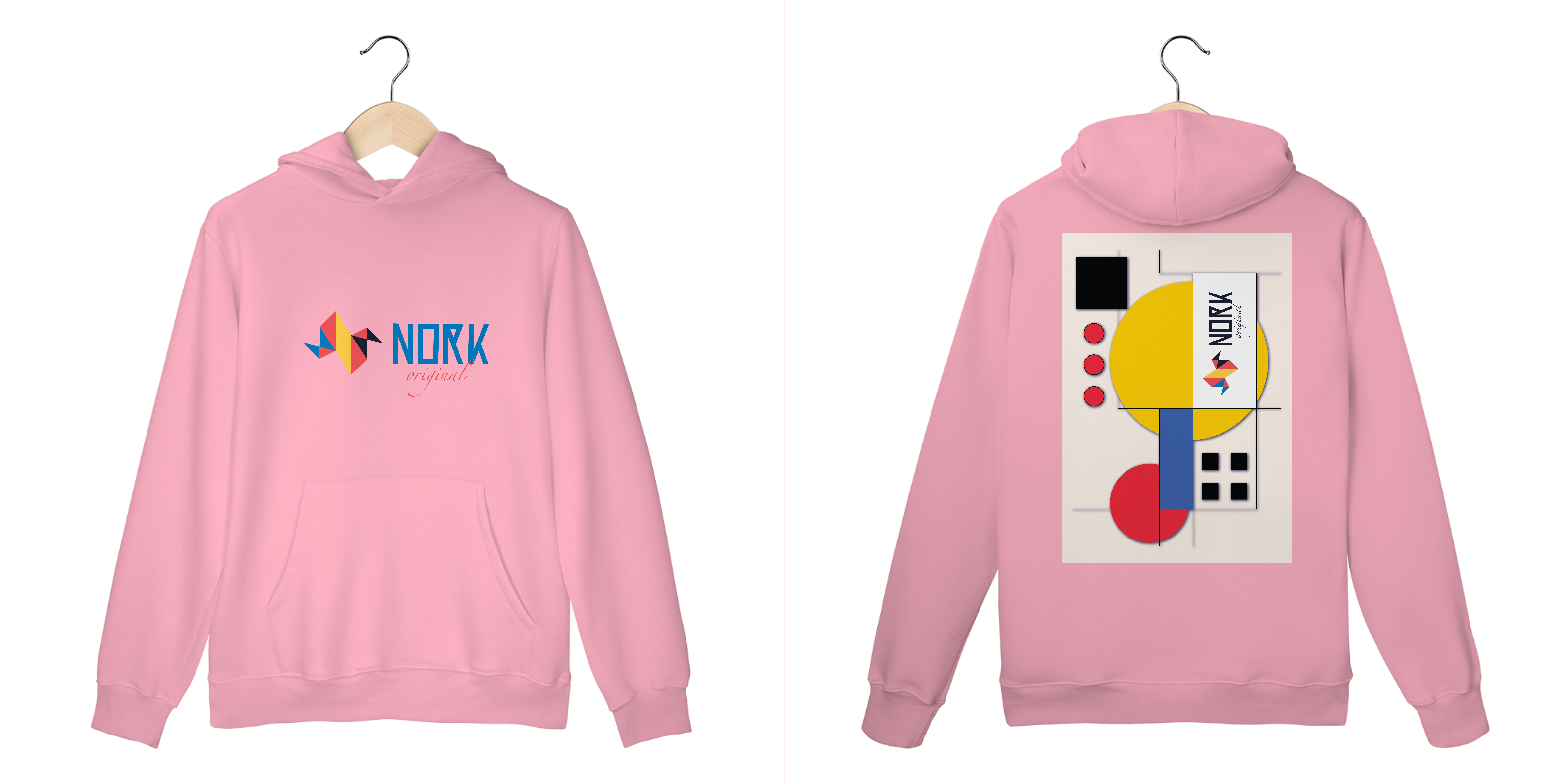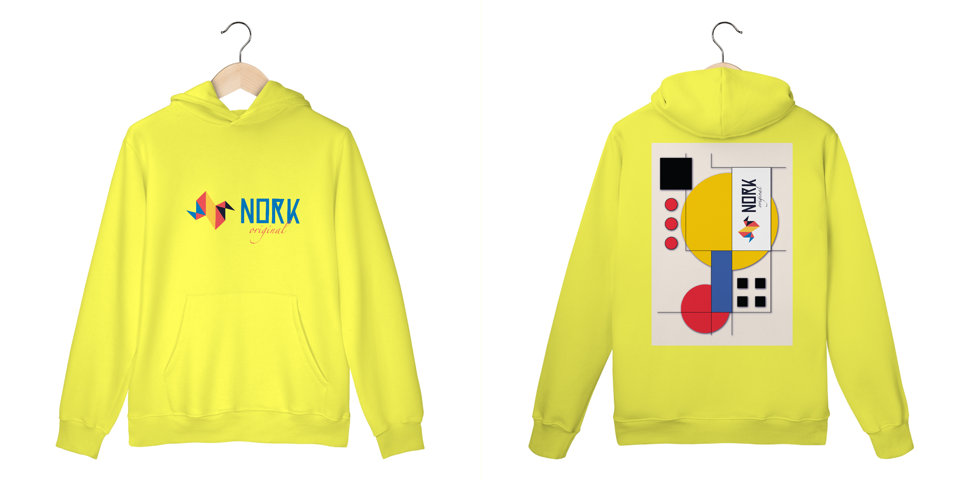 Coleção Nork Bauhaus traduz o espírito de inovação e simplicidade funcional característico do movimento que revolucionou o design moderno. Linhas retas delineiam blocos de cor em vermelho, amarelo e azul, enquanto formas geométricas como círculos, quadrados e retângulos se sobrepõem, criando uma composição lúdica e dinâmica. O destaque fica para o retângulo amarelo com o logo Nork, que agrega presença e identidade visual à peça.