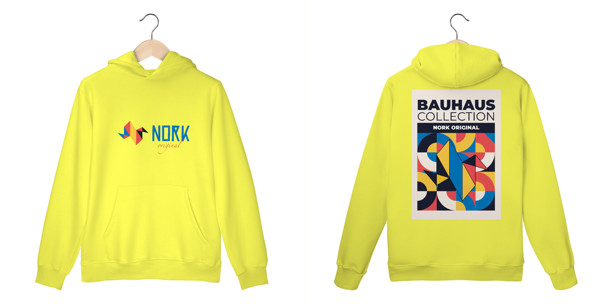 Coleção Nork Bauhaus apresenta uma composição geométrica autêntica, inspirada no movimento artístico que revolucionou o design no início do século XX. Formas circulares e blocos de cor se fundem em um mosaico arrojado, enquanto a figura central do pássaro angular evoca a criatividade e a liberdade características da Bauhaus.