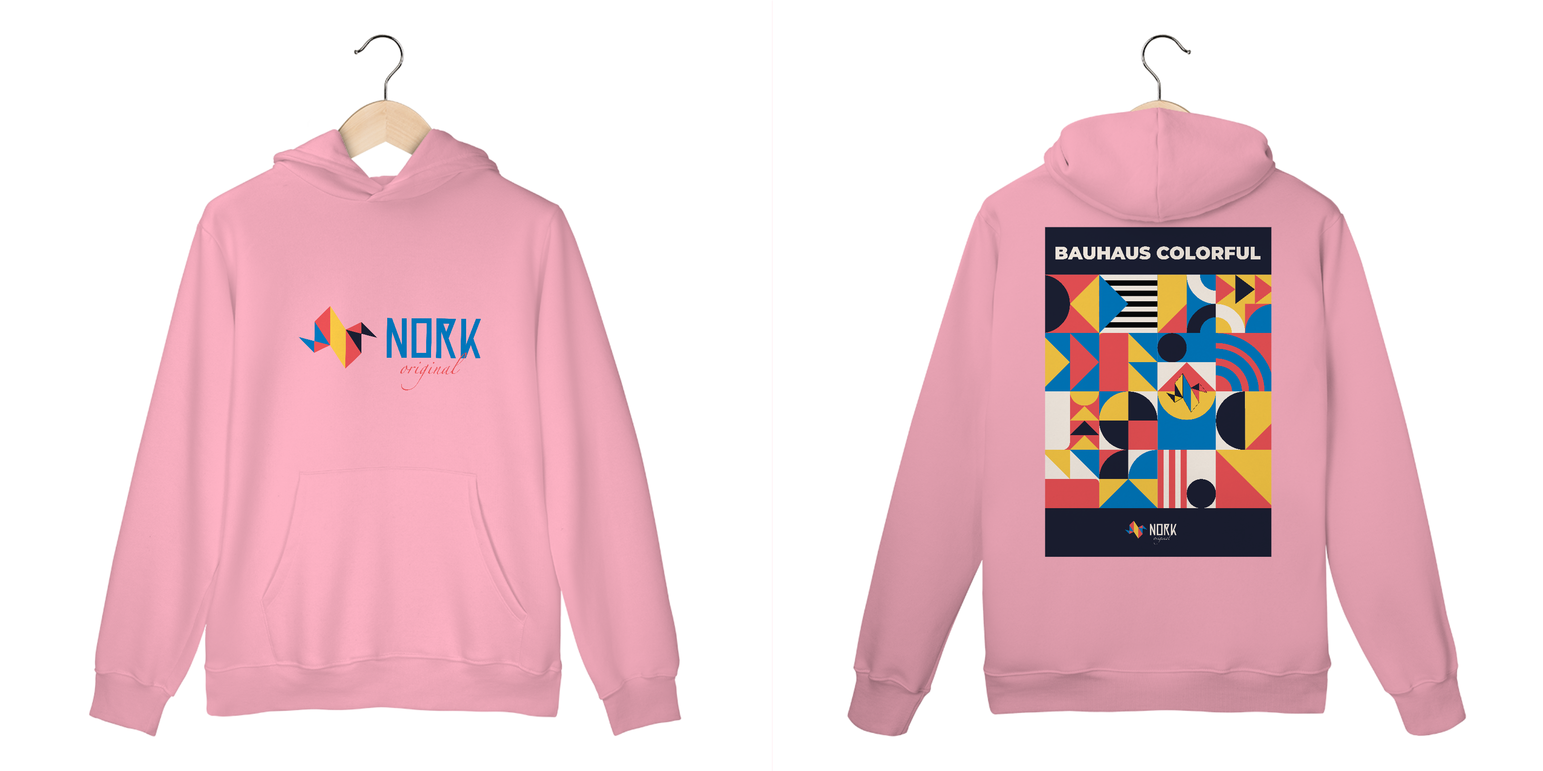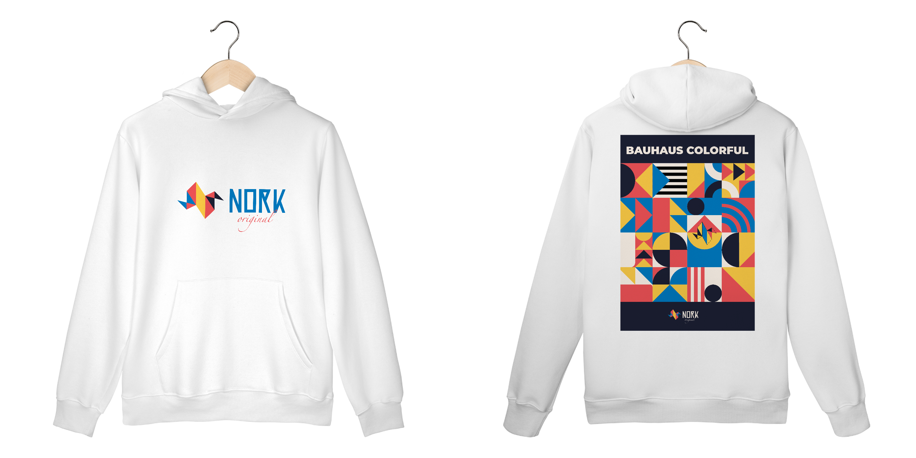 A diversidade de padrões, incluindo linhas diagonais, semicírculos e faixas listradas, cria uma atmosfera lúdica e ousada, ideal para quem busca autenticidade e expressividade no vestuário. O logotipo Nork em destaque reforça a identidade vanguardista da marca, unindo tradição e inovação em cada detalhe.