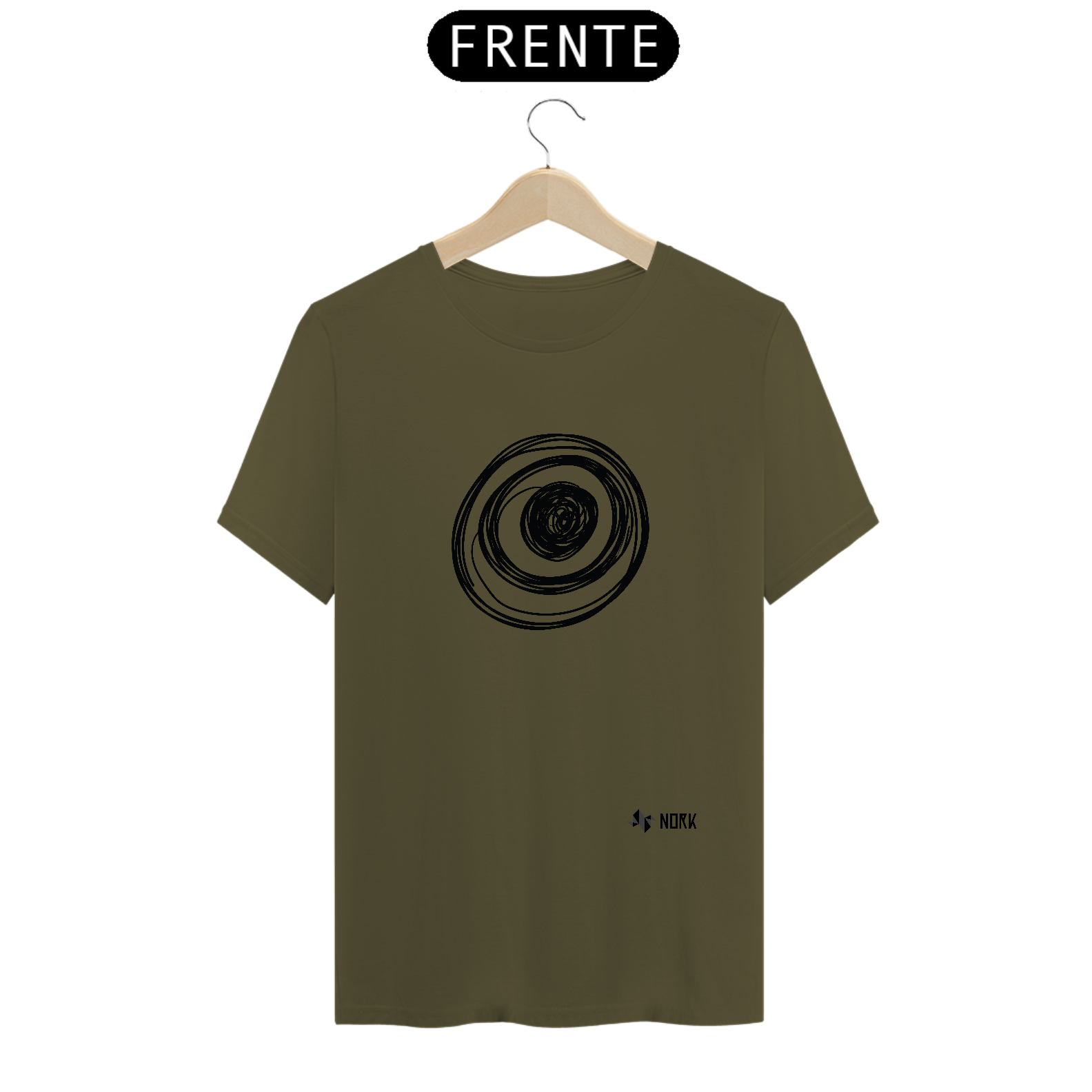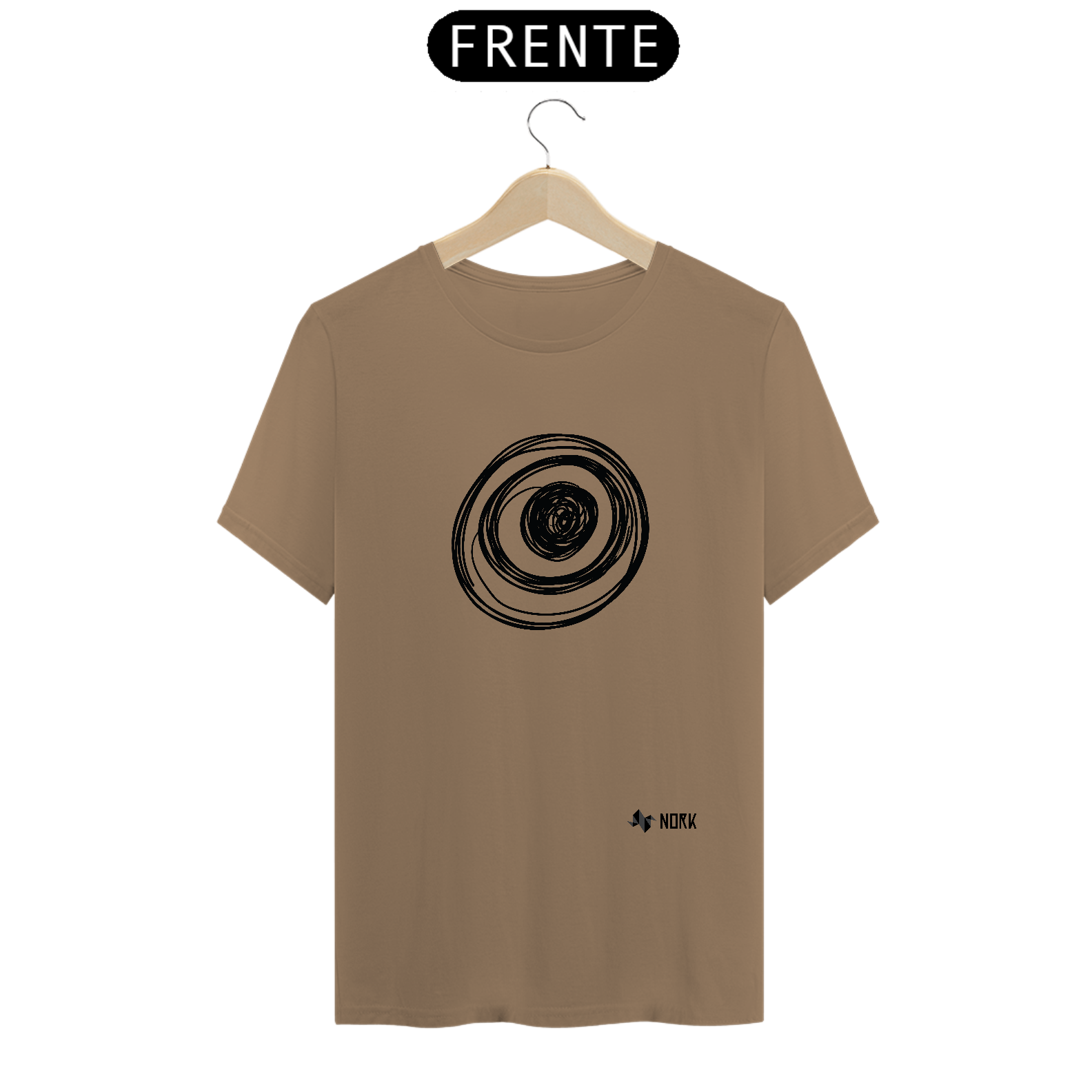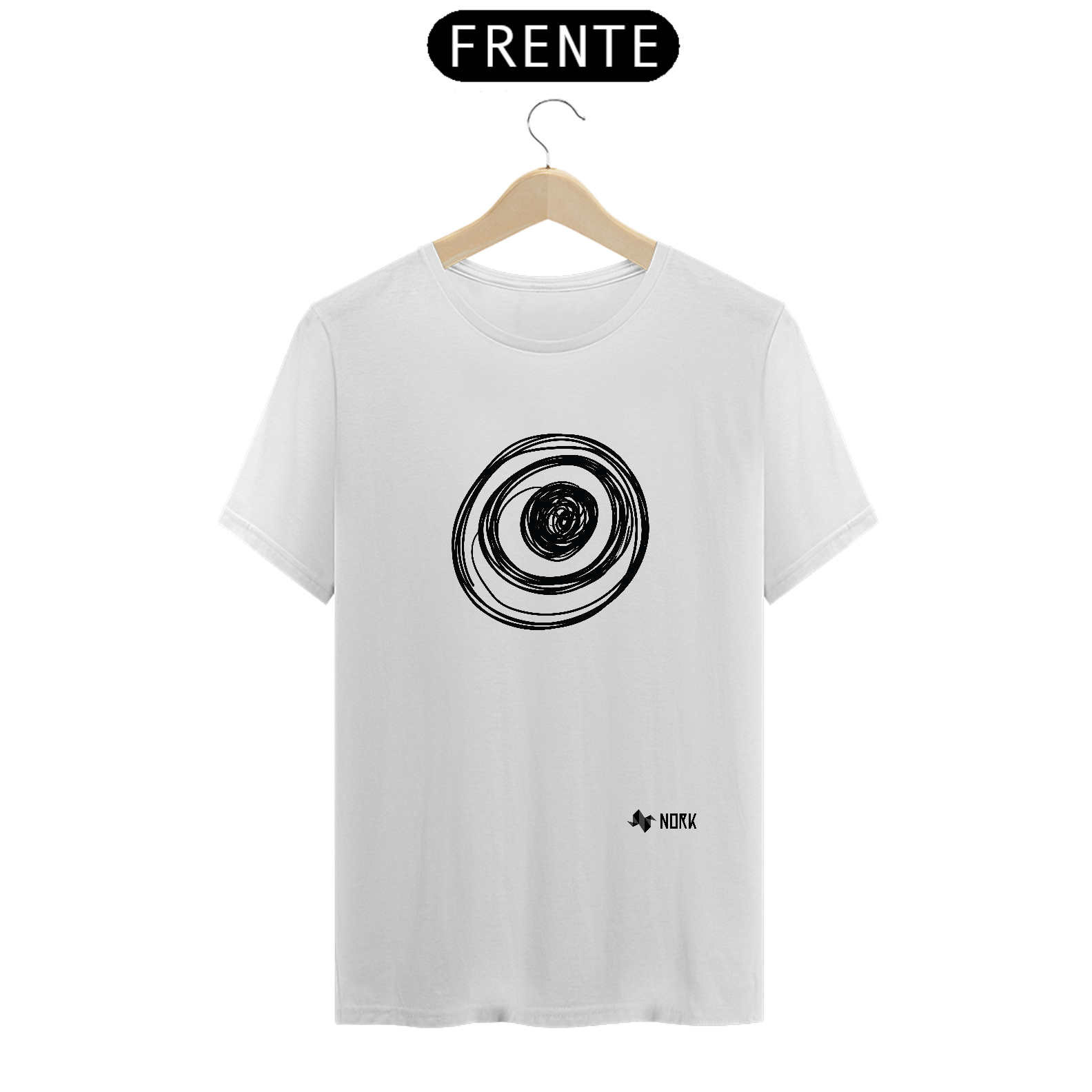 Um conjunto de círculos concêntricos em traços pretos sobrepostos, com um núcleo mais preenchido no centro. As linhas variam em espessura e formato, criando um efeito hipnótico e dinâmico, como se estivessem em constante movimento. A estética descontraída e espontânea dialoga perfeitamente com o conceito artístico e experimental da Coleção Nork Rabisco.