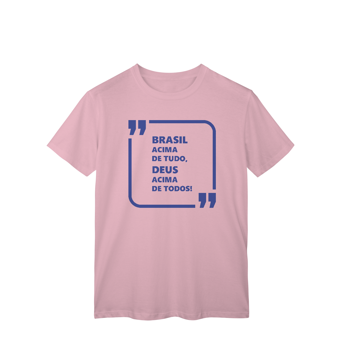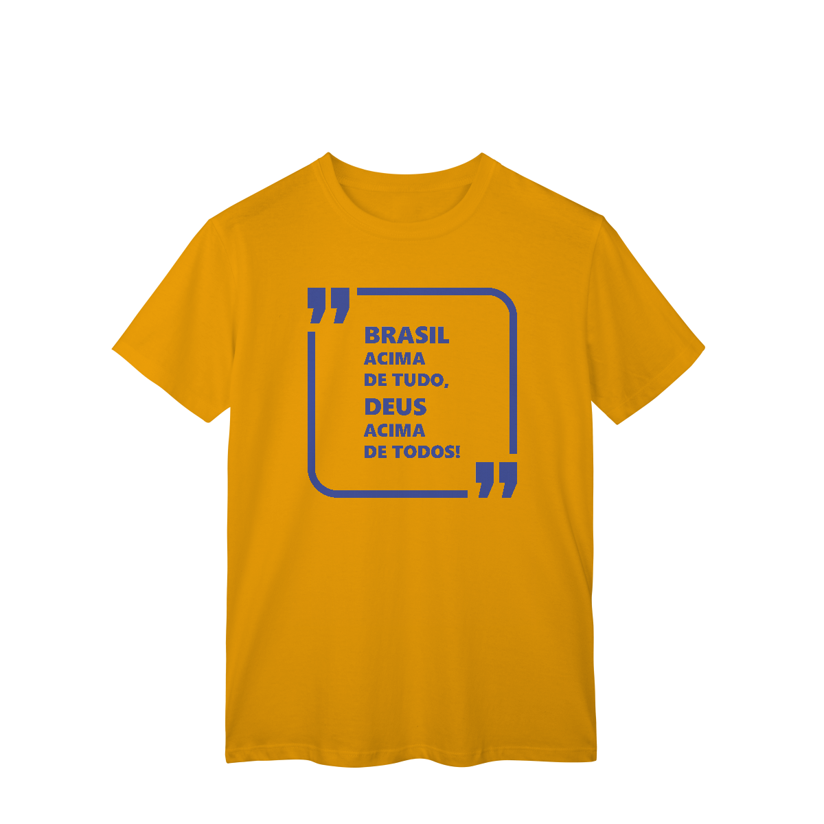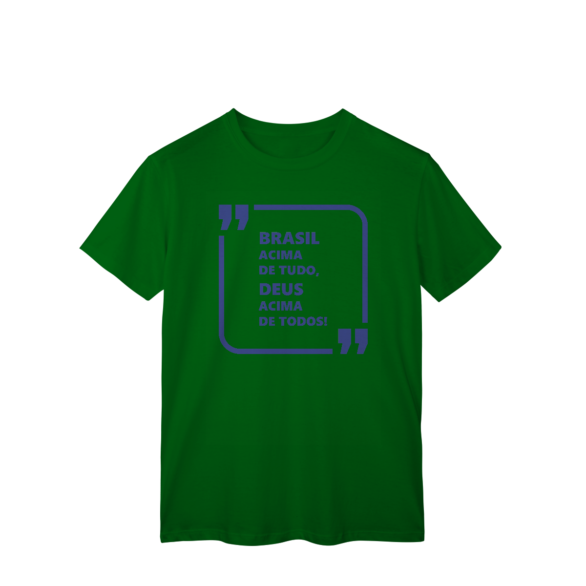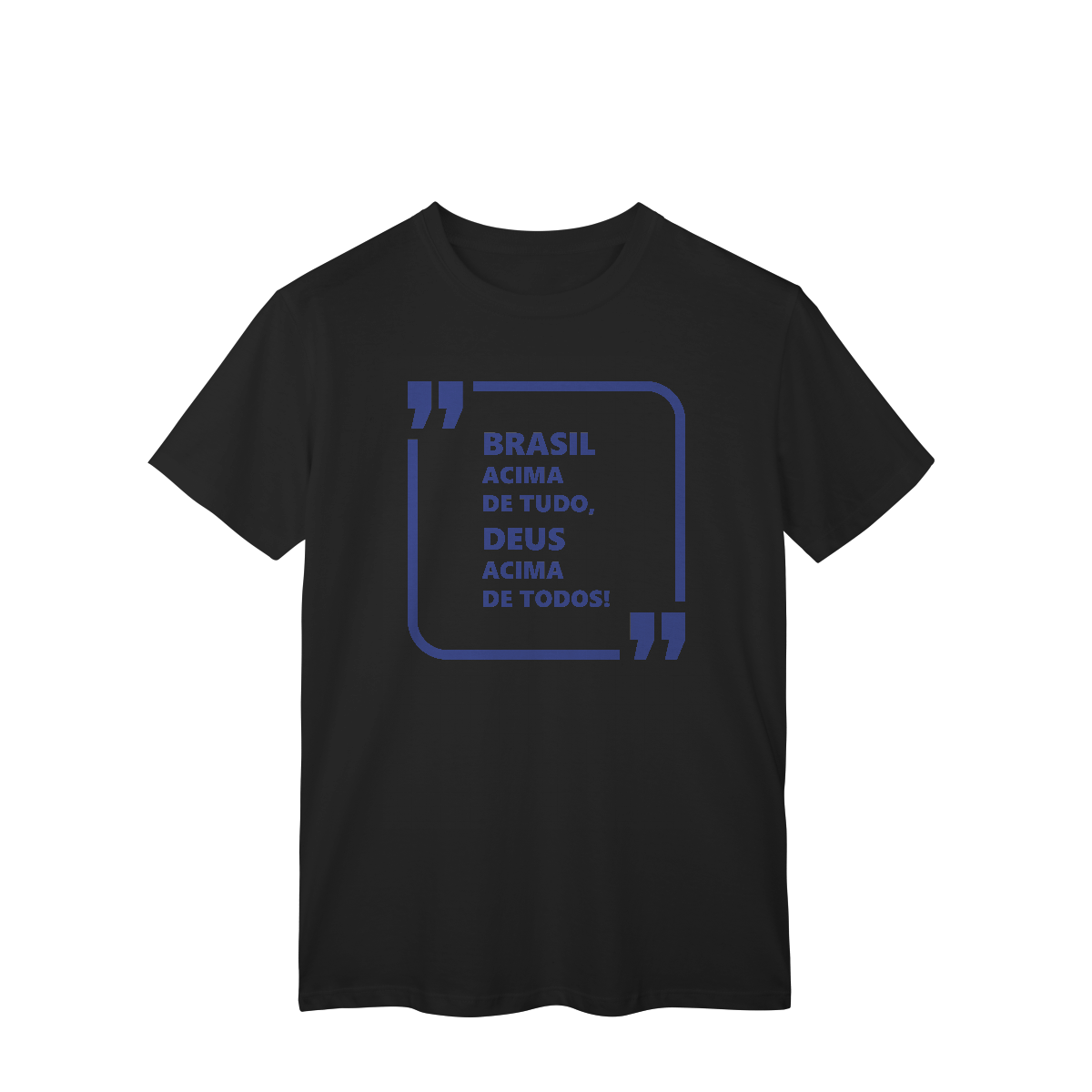 Uma frase que virou símbolo. A estampa “Brasil Acima de Tudo” exalta o lema que marcou uma geração de brasileiros patriotas: "Brasil acima de tudo, Deus acima de todos!"