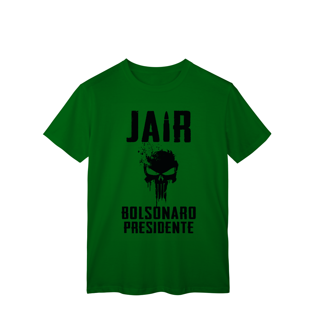 A estampa apresenta um layout centralizado com forte apelo visual e simbólico. No topo, a palavra JAIR aparece em caixa alta, com uma modificação gráfica na letra "I", substituída por uma bala de fuzil, elemento que remete a força, confronto e simbologia armamentista. Logo abaixo, surge o ícone estilizado do Justiceiro (Punisher), com efeito “spray” e respingos, evocando rebeldia e estética urbana, algo entre o grafite e o caos gráfico intencional.